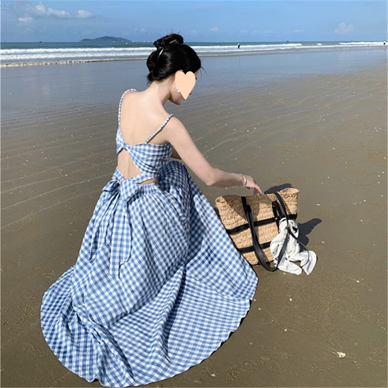 파란색과 흰색 격자 무늬가없는 카미 솔 조끼 여자 2025 년 여름 새로운 높은 허리 치마 세트 투피스 세트스토어 가기