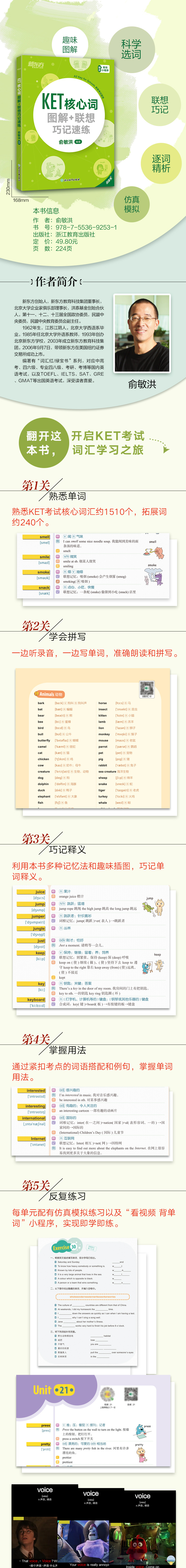 本书紧扣2020年剑桥KET新版考试要求,以KET官方真题为蓝本,从历届考试真题中精选KET考试核心词*1500个,拓展重要派生词及近义词*240个。书中选用了适合小学生记忆单词的联想记忆、词根记忆、比较记忆、发音记忆等多种有趣的记忆方法,为部分单词配备了生动有趣的助记插图。另外,本书还提供了单词例句、搭配用法、仿真模拟练习、MP3录音和“看视频 背单词”小程序,帮助考生即学即练、强化记忆,一举攻克KET考试。