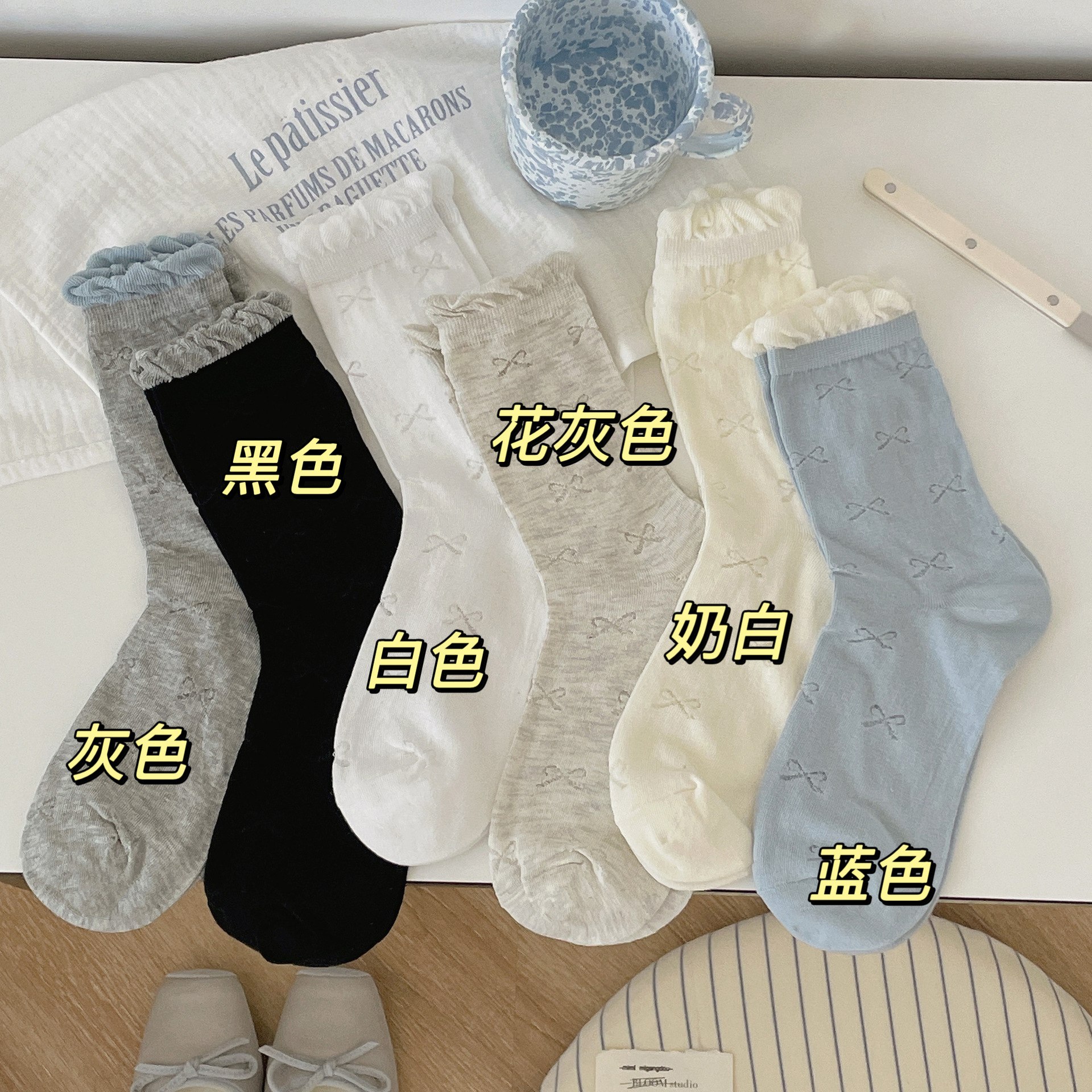 봄 여름 양말 여성용 종아리 중간 양말 흰색 중공 리본 양말 miu 스타일 회색 스타킹 레이스 버블 입스토어 가기