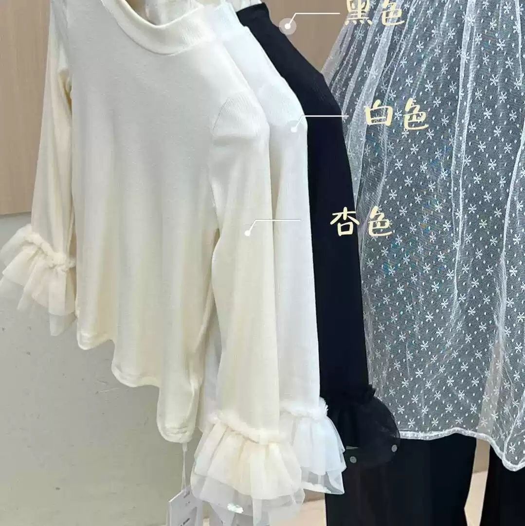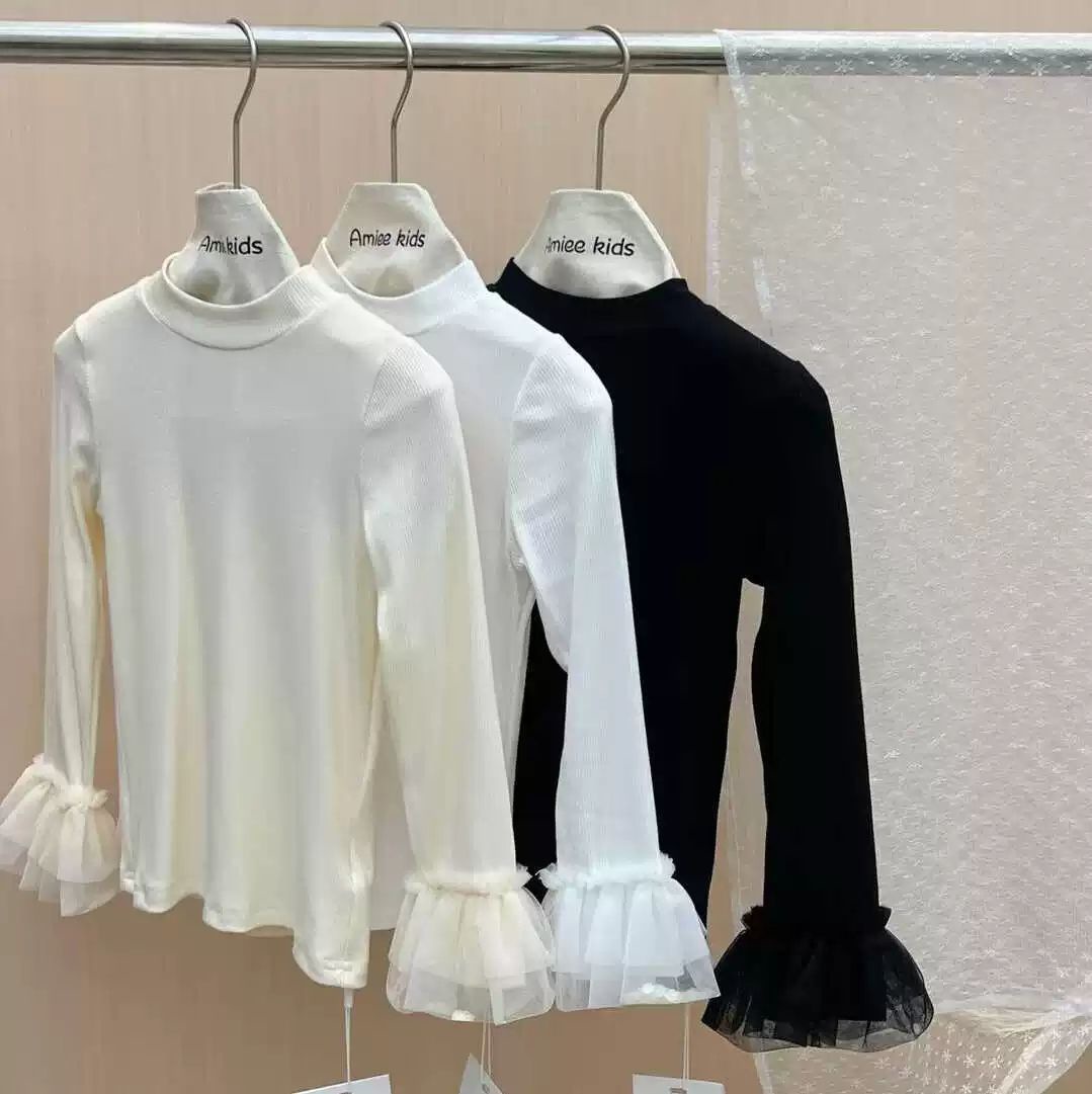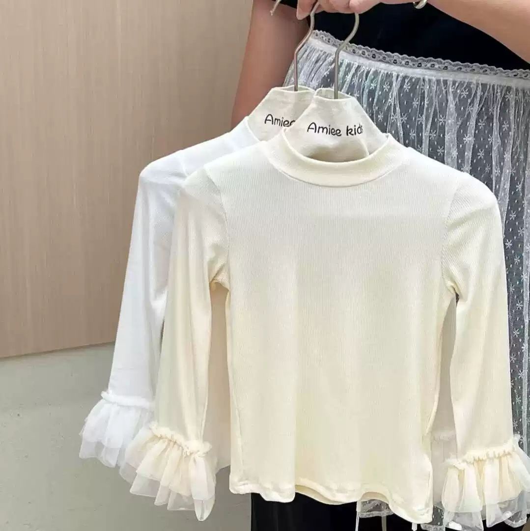 봄과 가을 여성 아동복 티셔츠 아기의 서양식 어린이 독특한 유행 한국 스타일 레이스 레이스 트럼펫 소매 유행베이스 셔츠스토어 가기