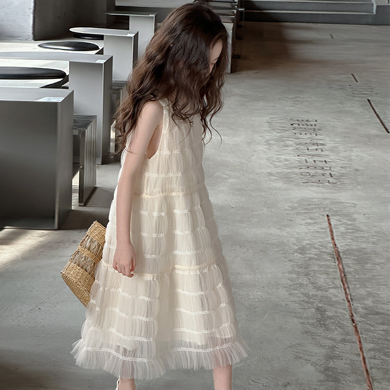 여자 민소매 원피스 여름 새로운 유행 간단한 조끼 원피스 세련된 소녀의 휴가 스타일 메시 공주 원피스스토어 가기
