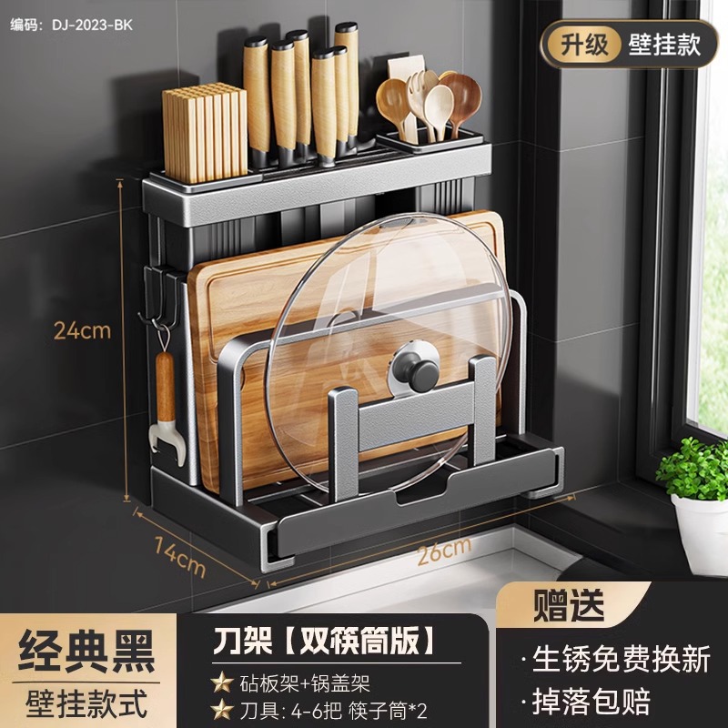 • 업그레이드된 두꺼운 클래식 블랙 [이중 젓가락통 벽걸이형] 도마걸이 + 냄비뚜껑걸이 + 고리*4