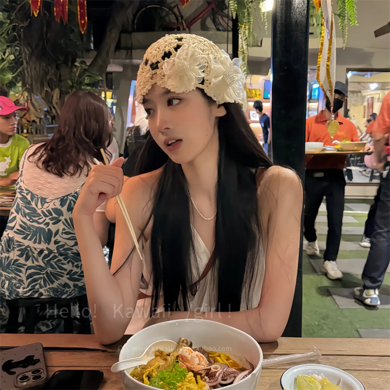 2025 년 봄과 여름 새로운 진주 꽃 풀오버 모자 여성 수제 크로 셰 니트 할로우 올 매치 힙 캡스토어 가기