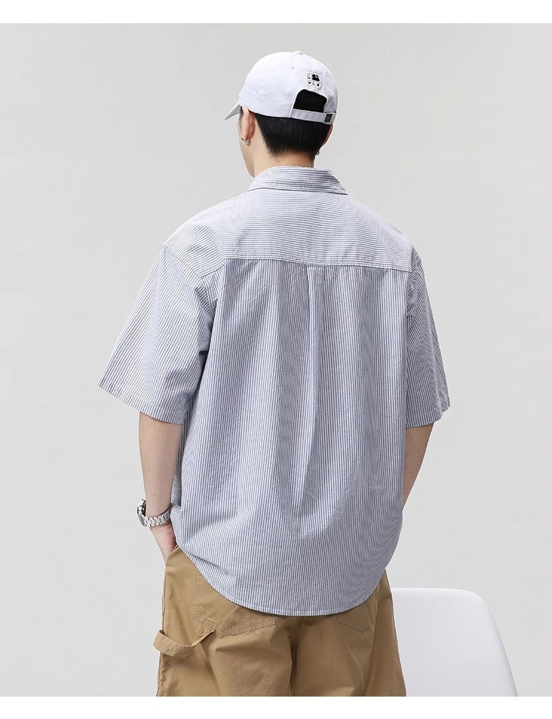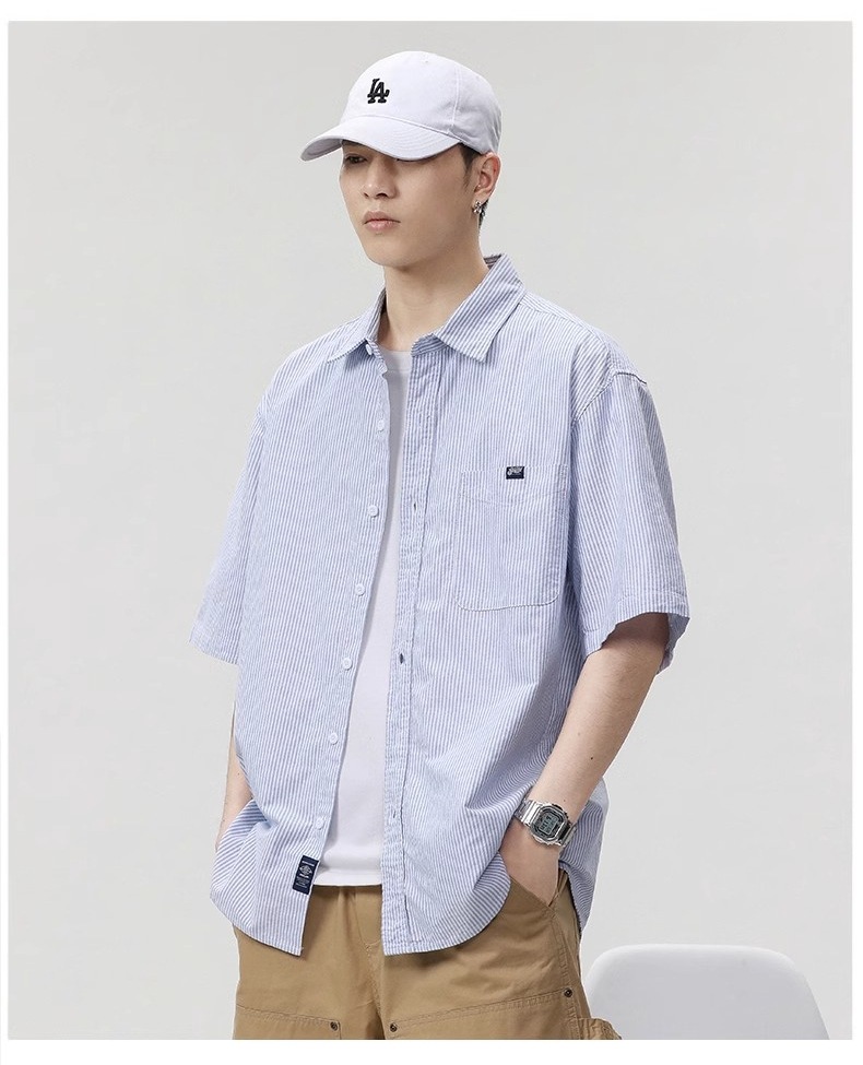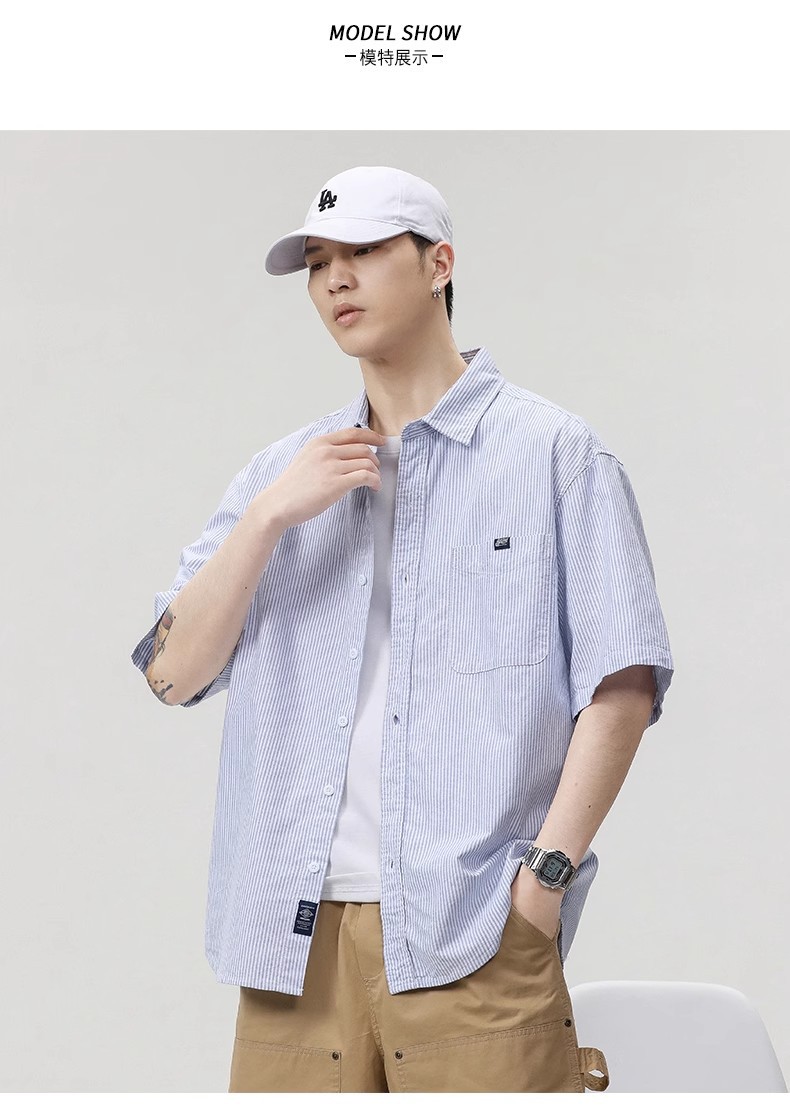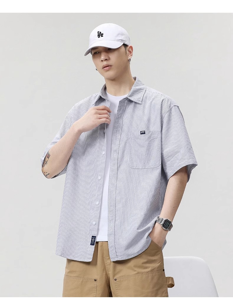 일본 스타일 패션 스트라이프 반팔 셔츠 남성 여름 시티보이 캐주얼 다용도 루즈핏 라지 사이즈 카라 셔츠스토어 가기