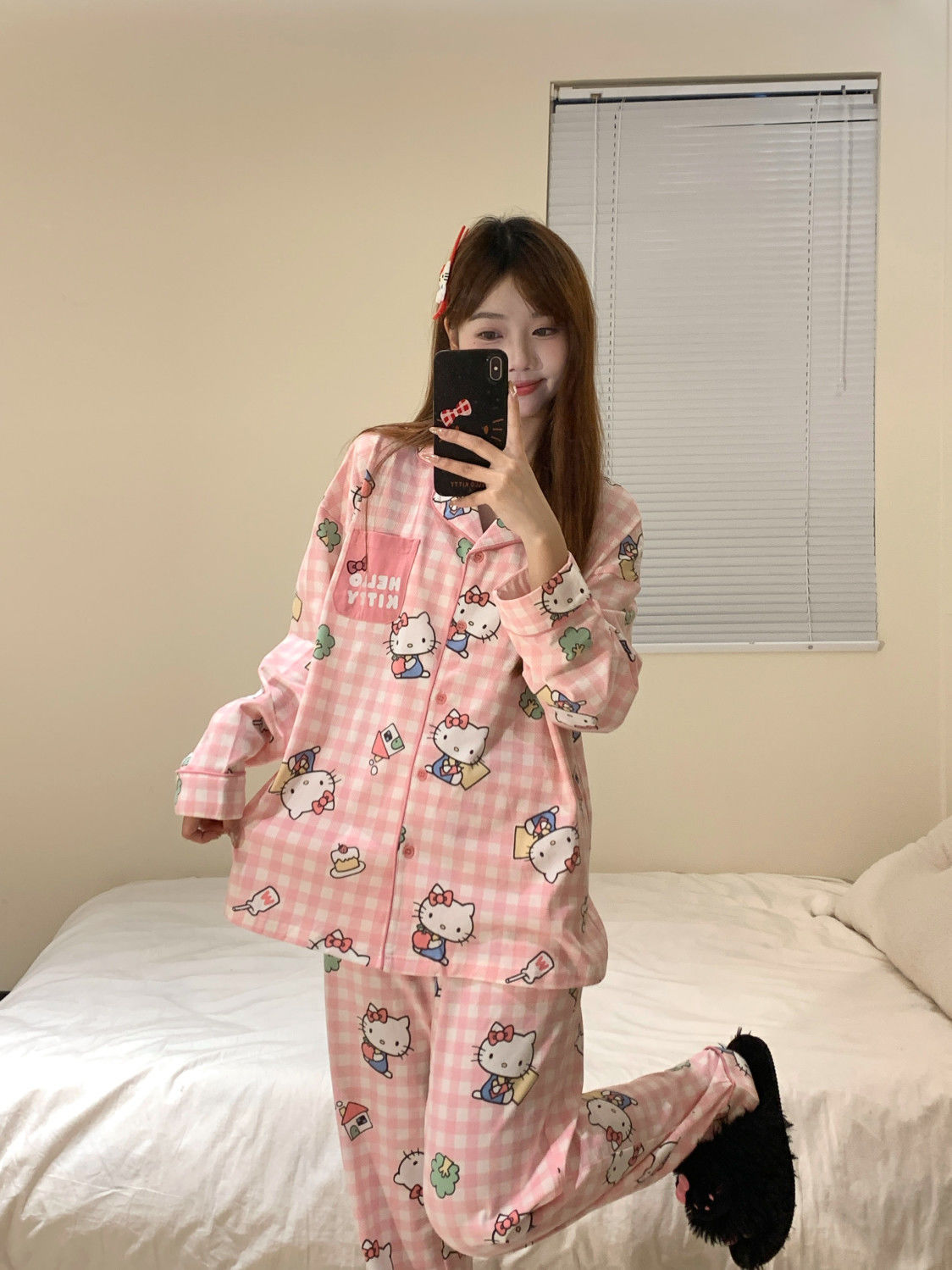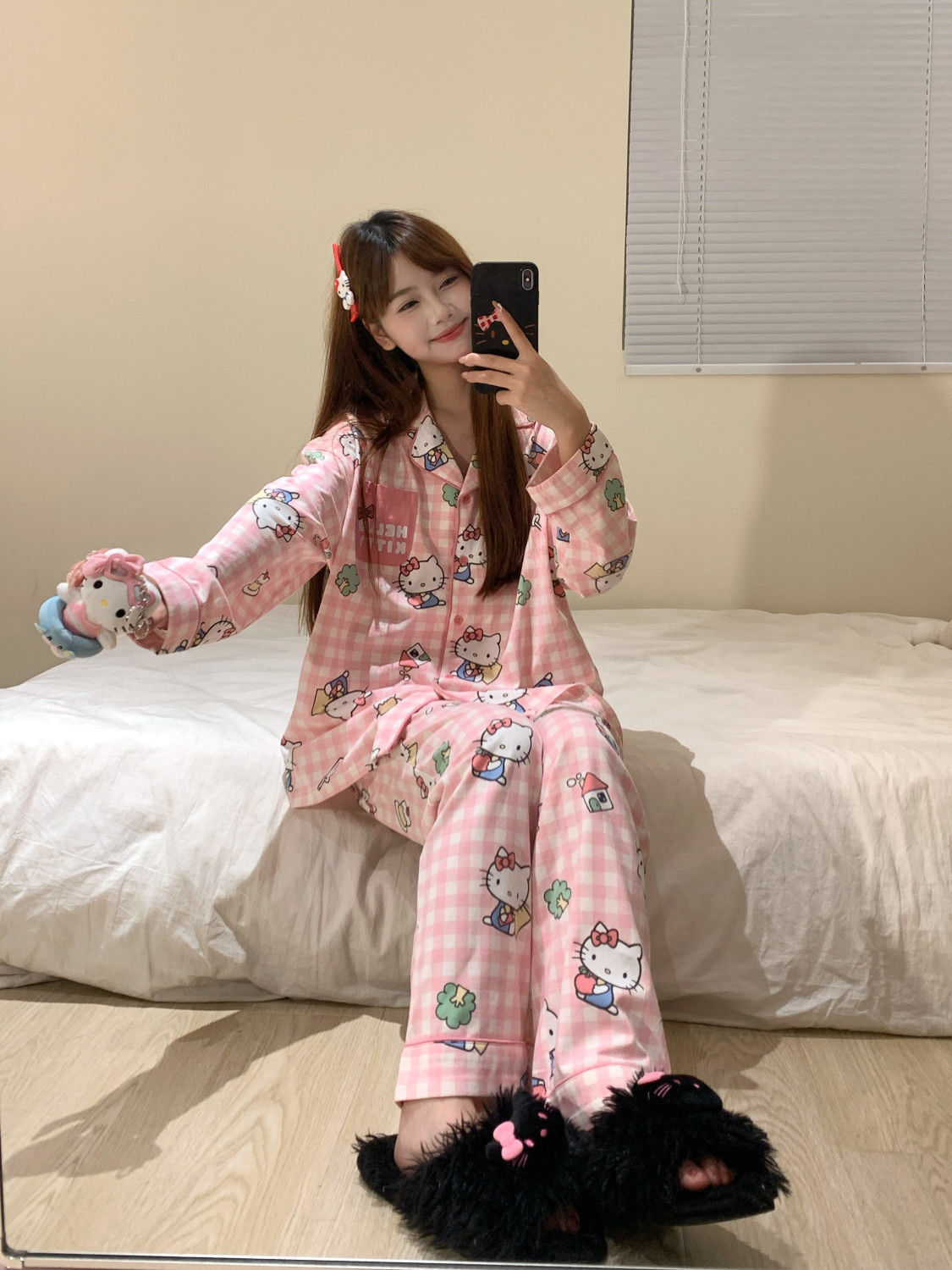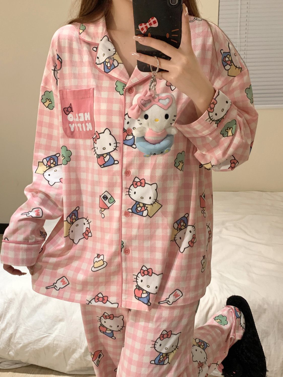 격자 무늬 hellokitty 고양이 잠옷 여성의 봄과 가을 새로운 긴 소매 일본 스타일 만화 학생 홈 의류 세트 외부 착용스토어 가기