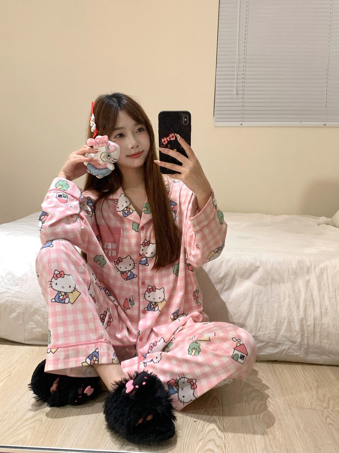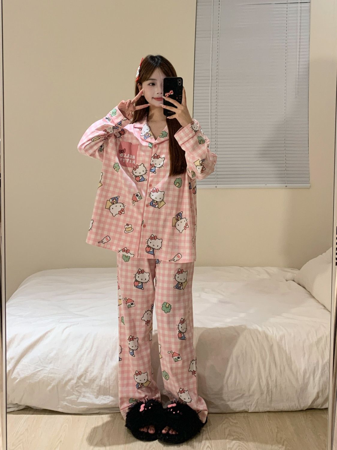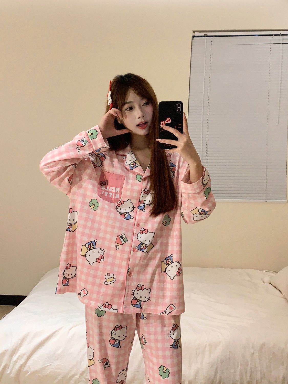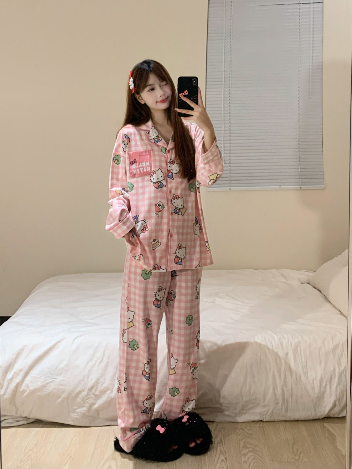 격자 무늬 hellokitty 고양이 잠옷 여성의 봄과 가을 새로운 긴 소매 일본 스타일 만화 학생 홈 의류 세트 외부 착용스토어 가기