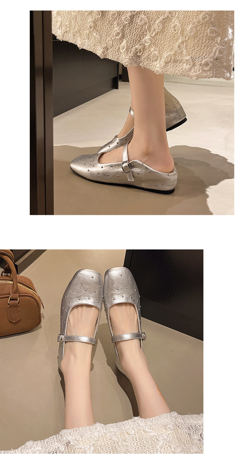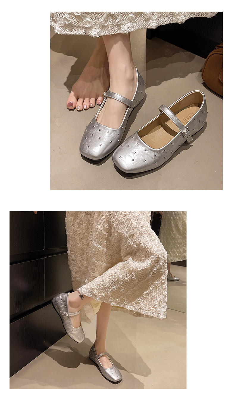 2025 봄 새 한국식 레트로 발레 신발 리벳 스퀘어 발가락 편평한 싱글 레이어 신발 버클 높이 증가 메리 제인 신발
