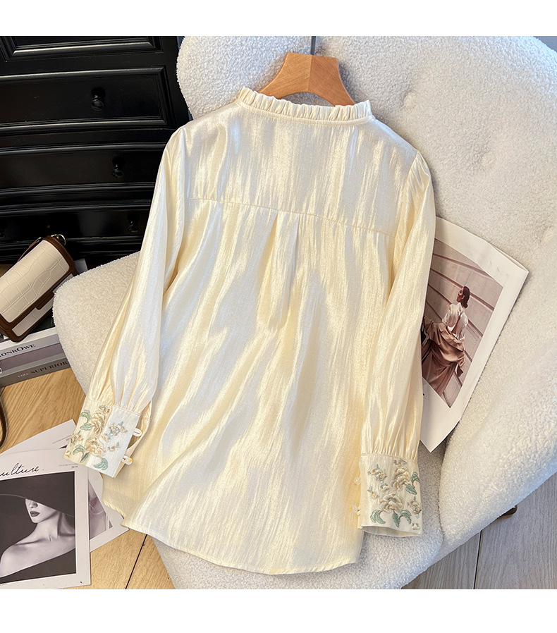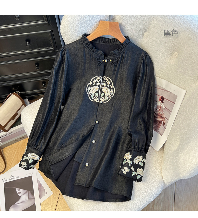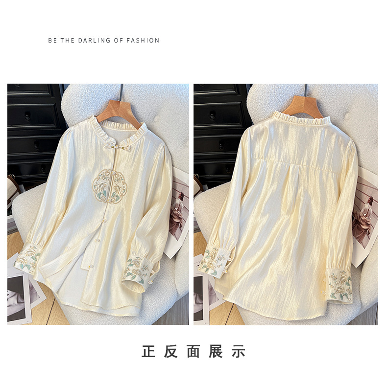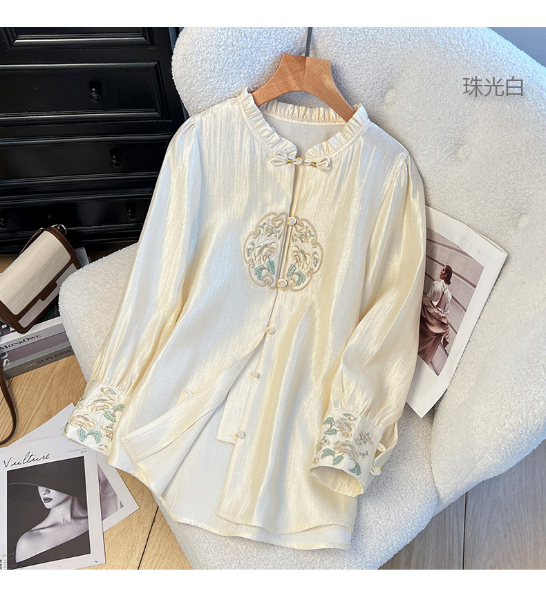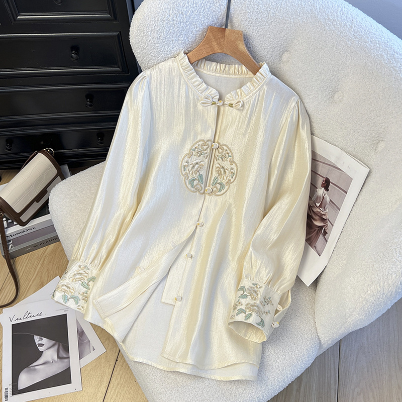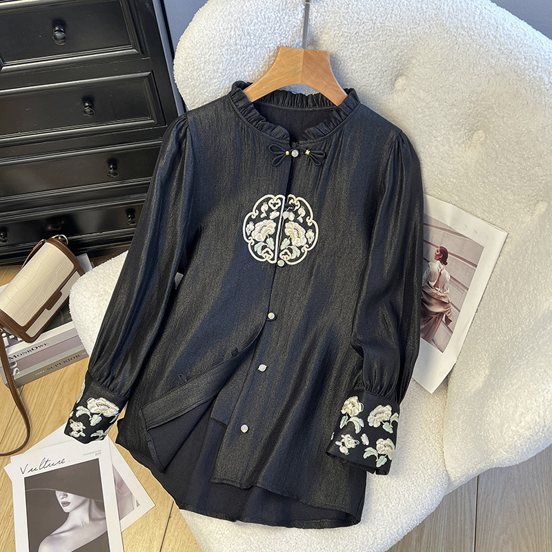 새로운 중국 자수 셔츠 여성의 봄 2025 새로운 빈티지 국가 스타일 디자인 유명 인사를위한 긴 소매 탑