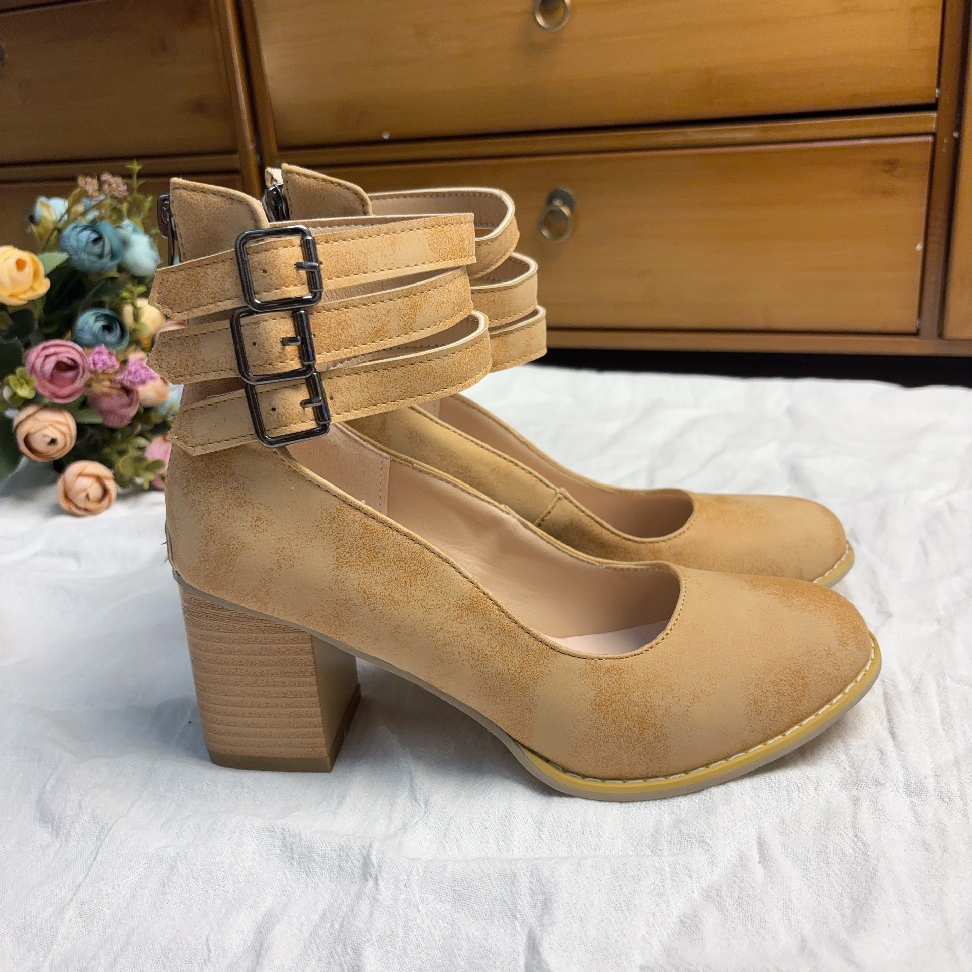 유럽과 미국의 여름 새로운 두꺼운 뒤꿈치 샌들 여성 대외 무역 새로운 플러스 사이즈 여성 신발 버클 뾰족한 샌들 여성 신발 국경스토어 가기