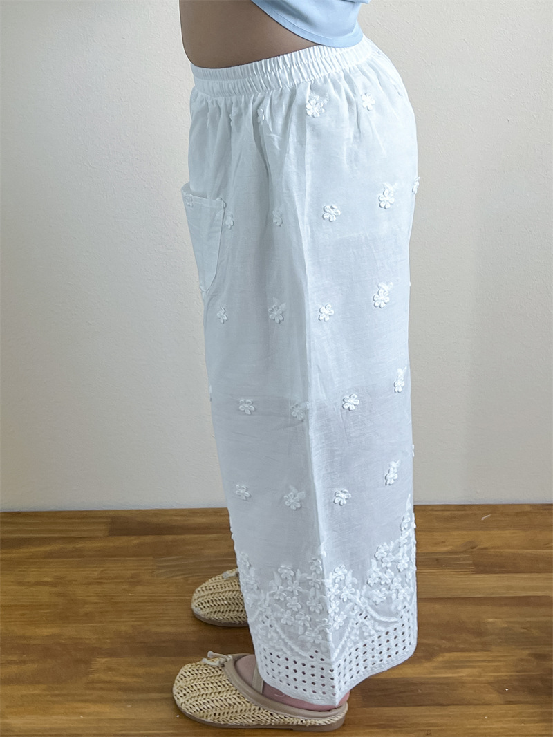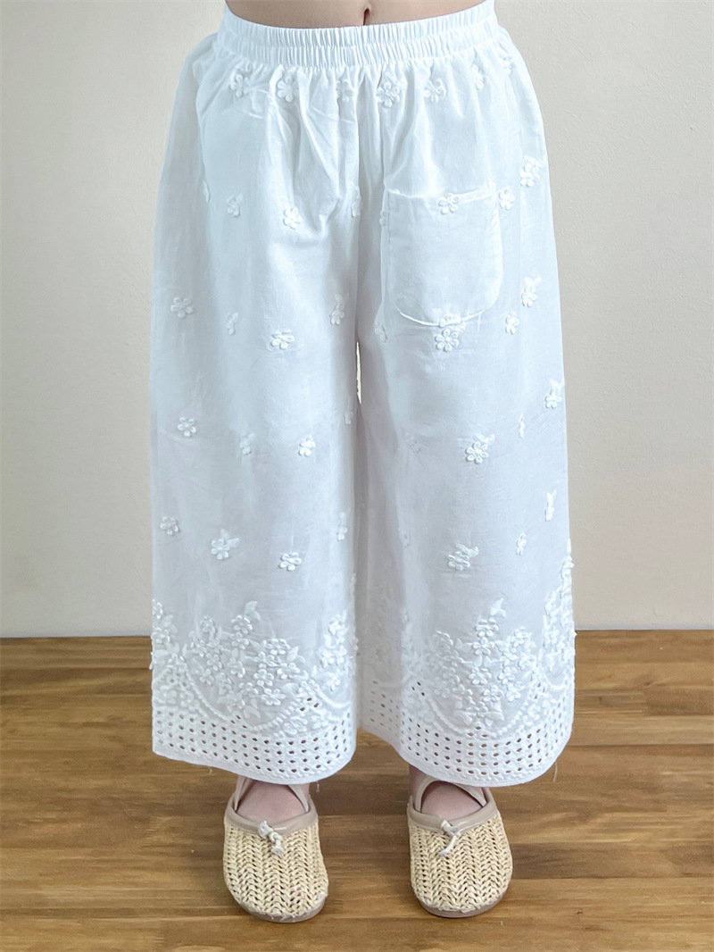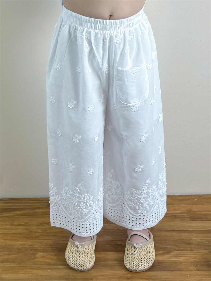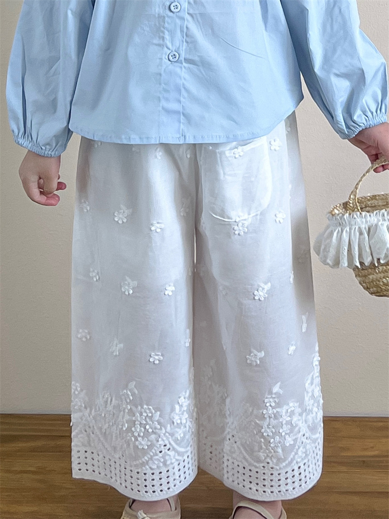 한국 아동복 소녀 봄과 여름 유행 스타일 캐주얼 화이트 중공업 자수 레이스 할로우 아웃 와이드 레그 바지