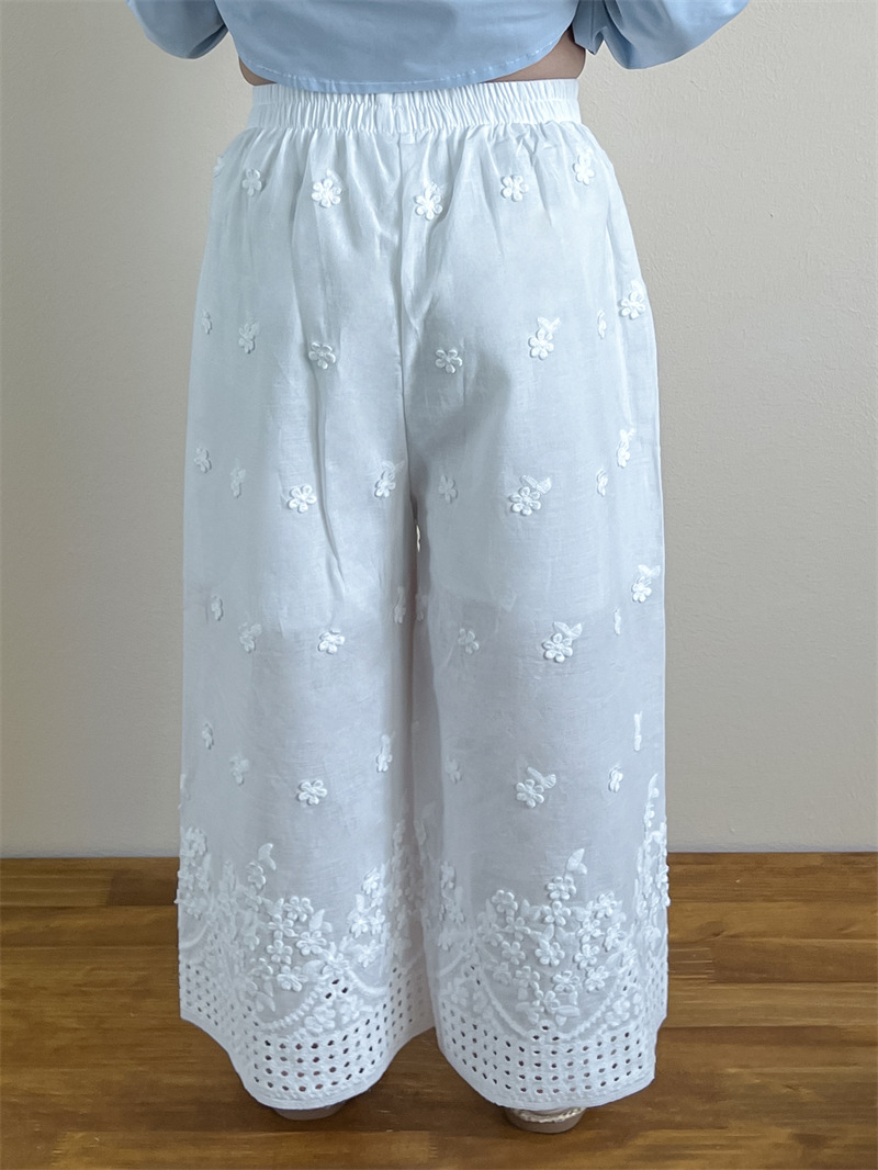 한국 아동복 소녀 봄과 여름 유행 스타일 캐주얼 화이트 중공업 자수 레이스 할로우 아웃 와이드 레그 바지스토어 가기