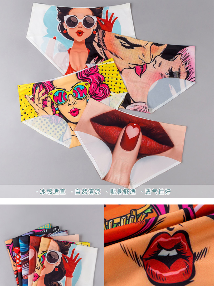 Catgirl 일본 얼음 실크 원활한 인쇄 여성 속옷 중간 허리 귀여운 달콤한 소녀 팬티 통기성 누드 느낌