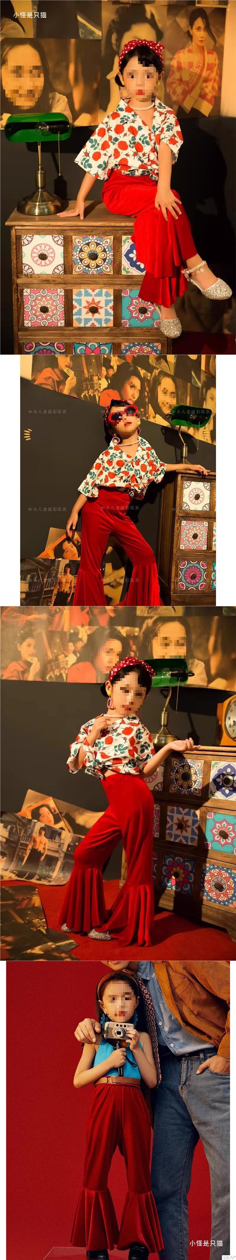 • 【010】플로럴 셔츠 + 레드 벨벳 나팔바지 + 헤어 액세서리 + 귀