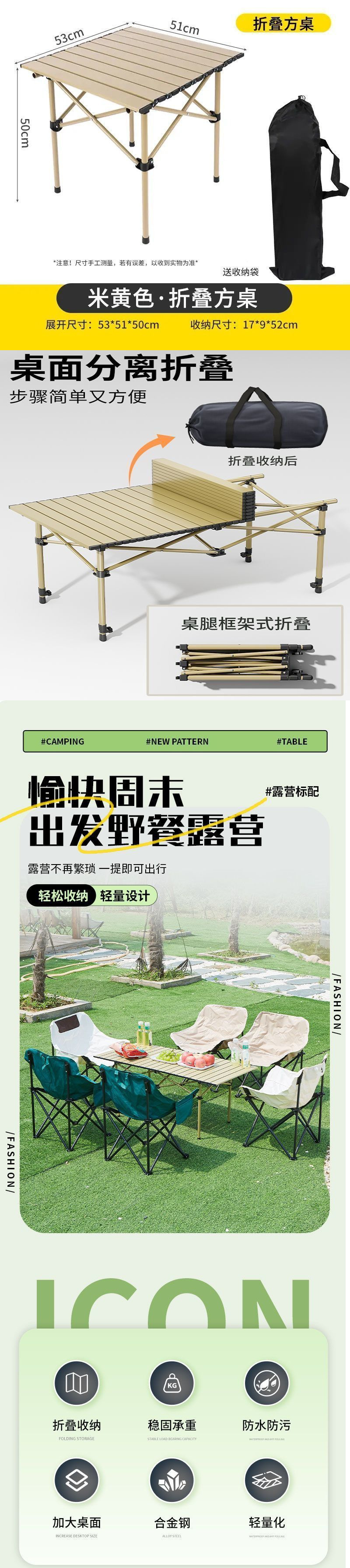 • [강력한 내하력 | 두꺼운 철합금] 유사황색-[53*51cm 사각 테이블] + 수납가방