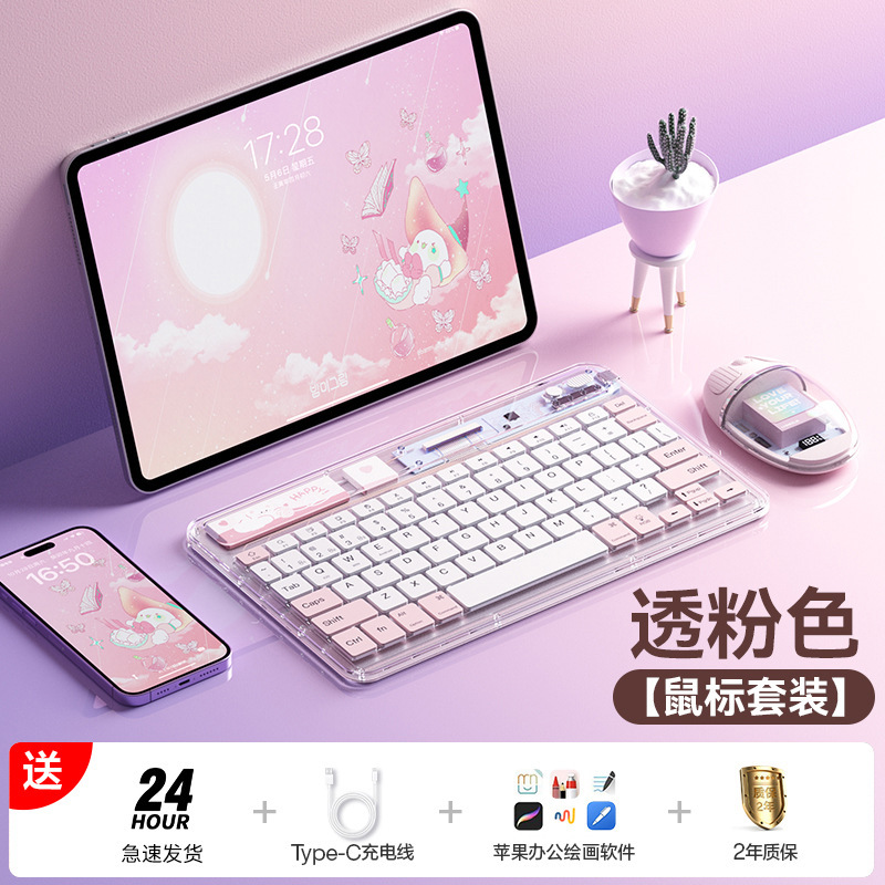 • [투명 핑크 키보드 + 마우스 패키지] 다중 장치 연결 지원❤지연 없음❤가벼운 톤❤얇고 가벼운