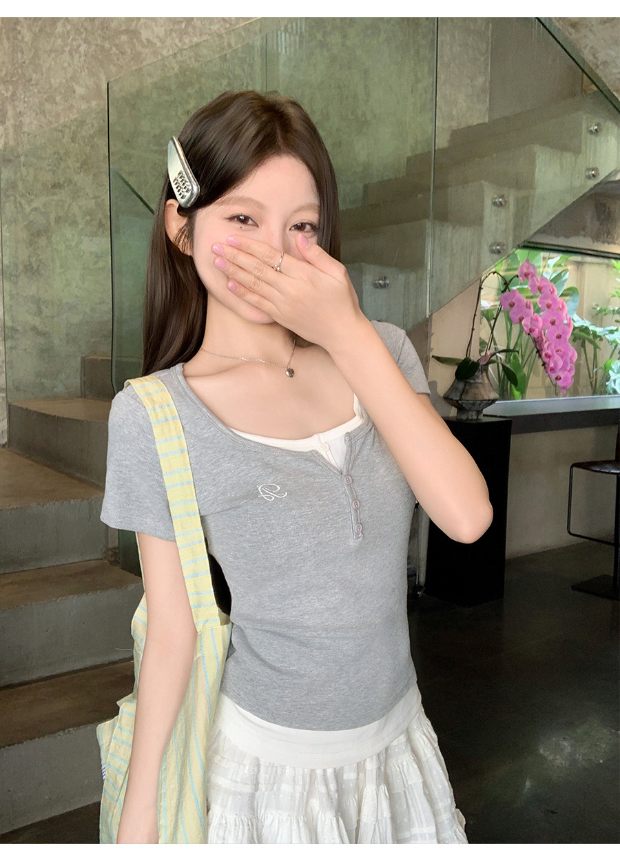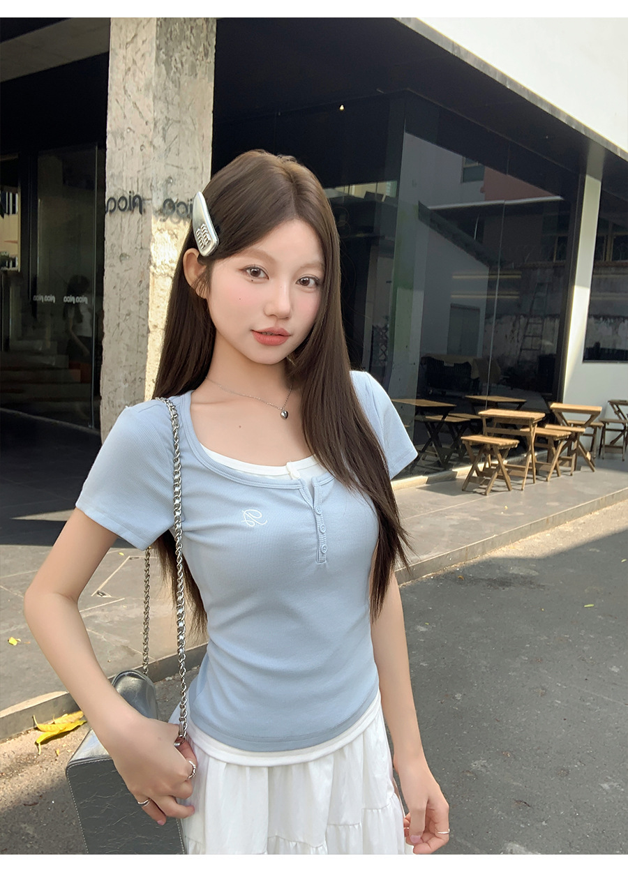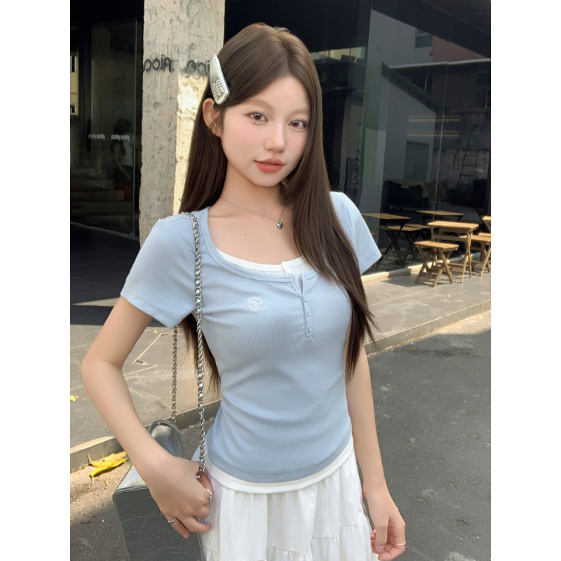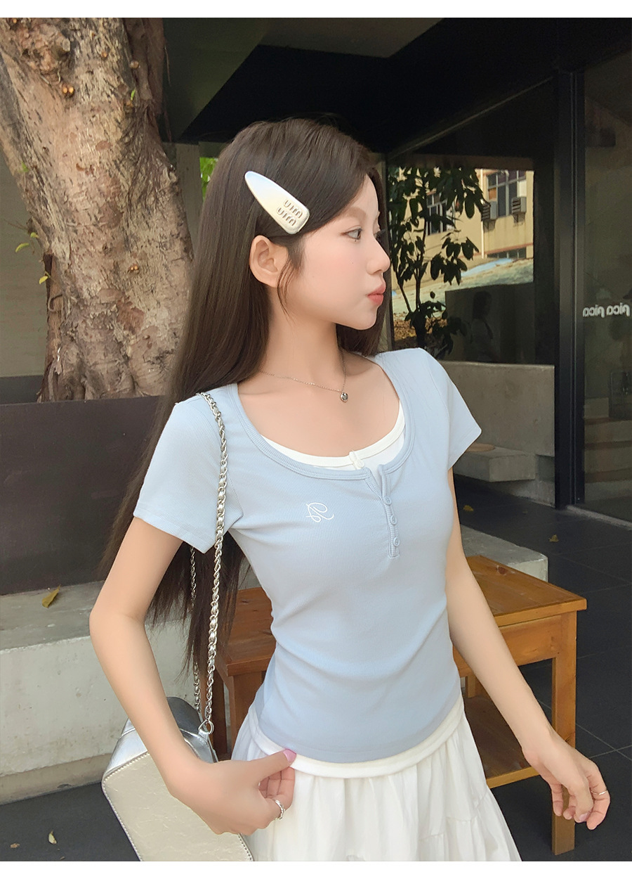 리얼 샷 디자인 센스 U 칼라 가짜 투피스 반팔 티셔츠 여성용 2025 년 여름 새로운 슬림 핏 슬림 핏 쇼트 탑
