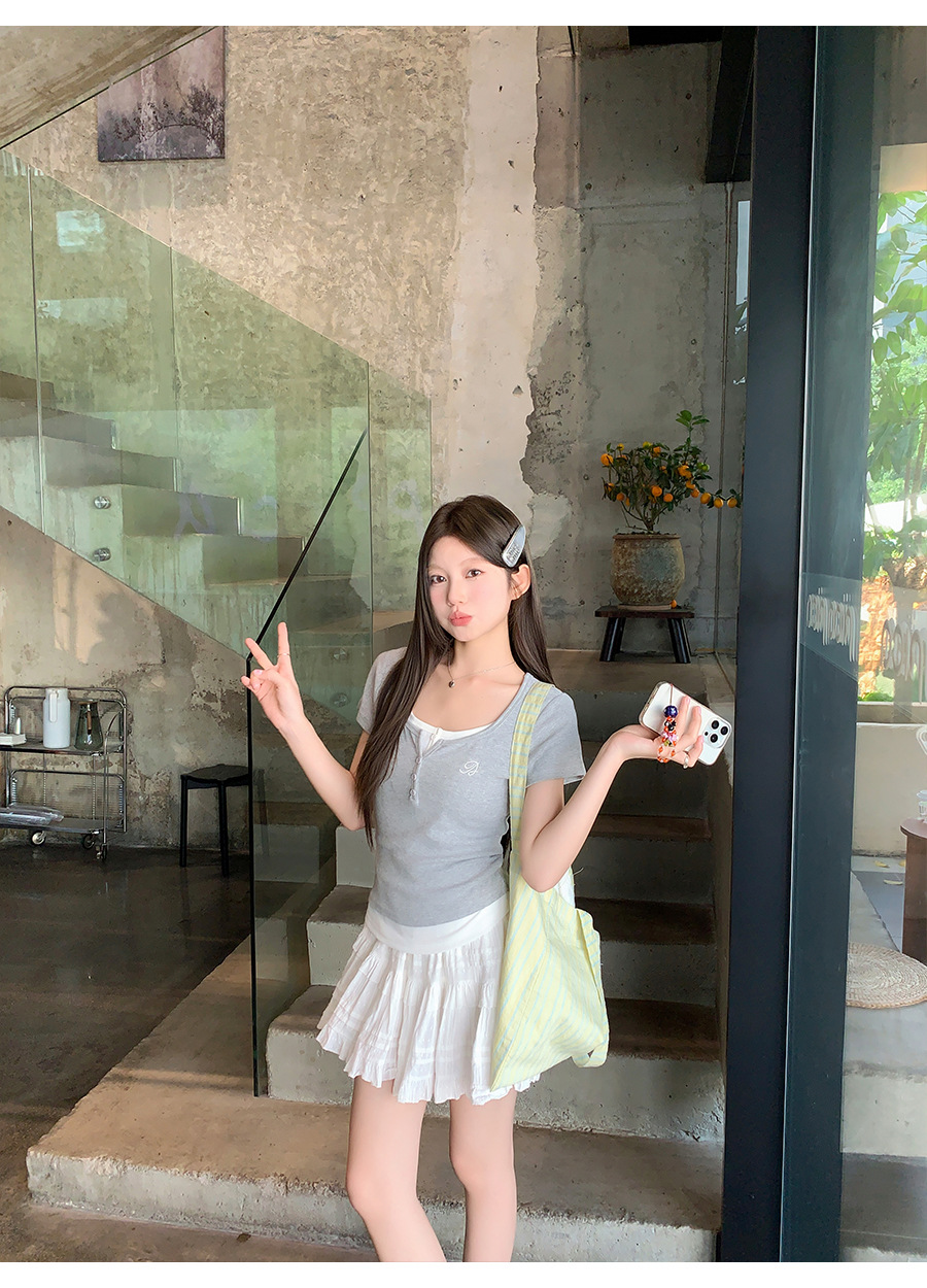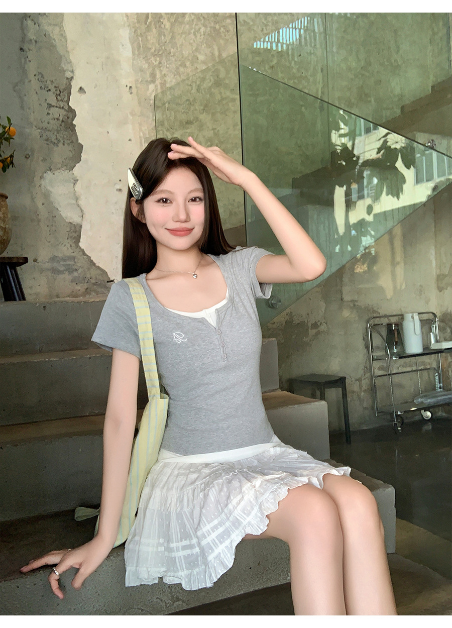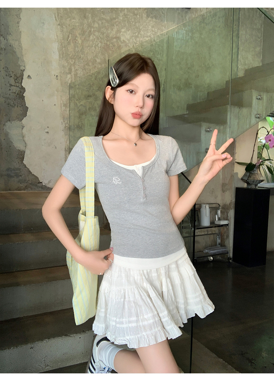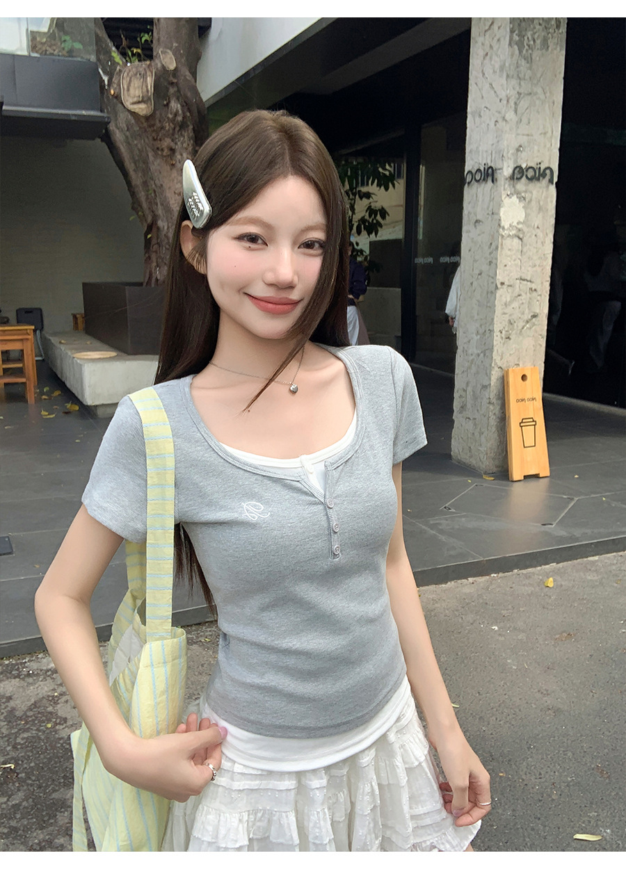 리얼 샷 디자인 센스 U 칼라 가짜 투피스 반팔 티셔츠 여성용 2025 년 여름 새로운 슬림 핏 슬림 핏 쇼트 탑