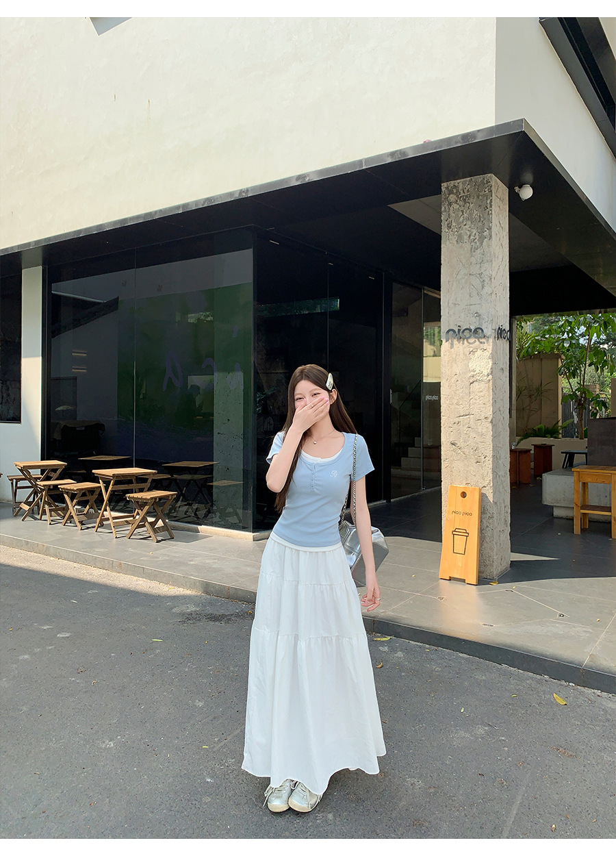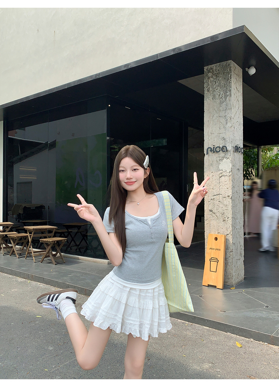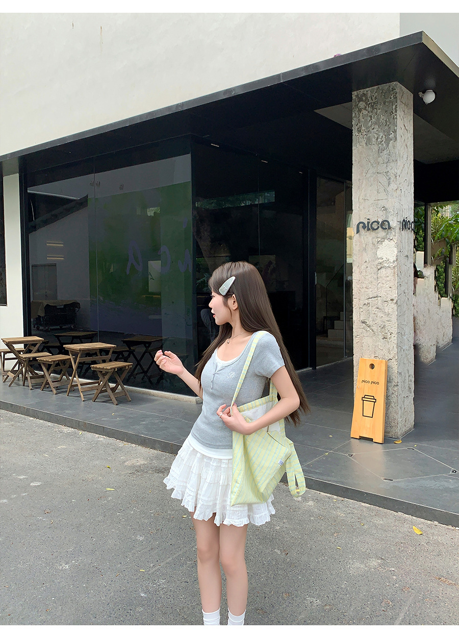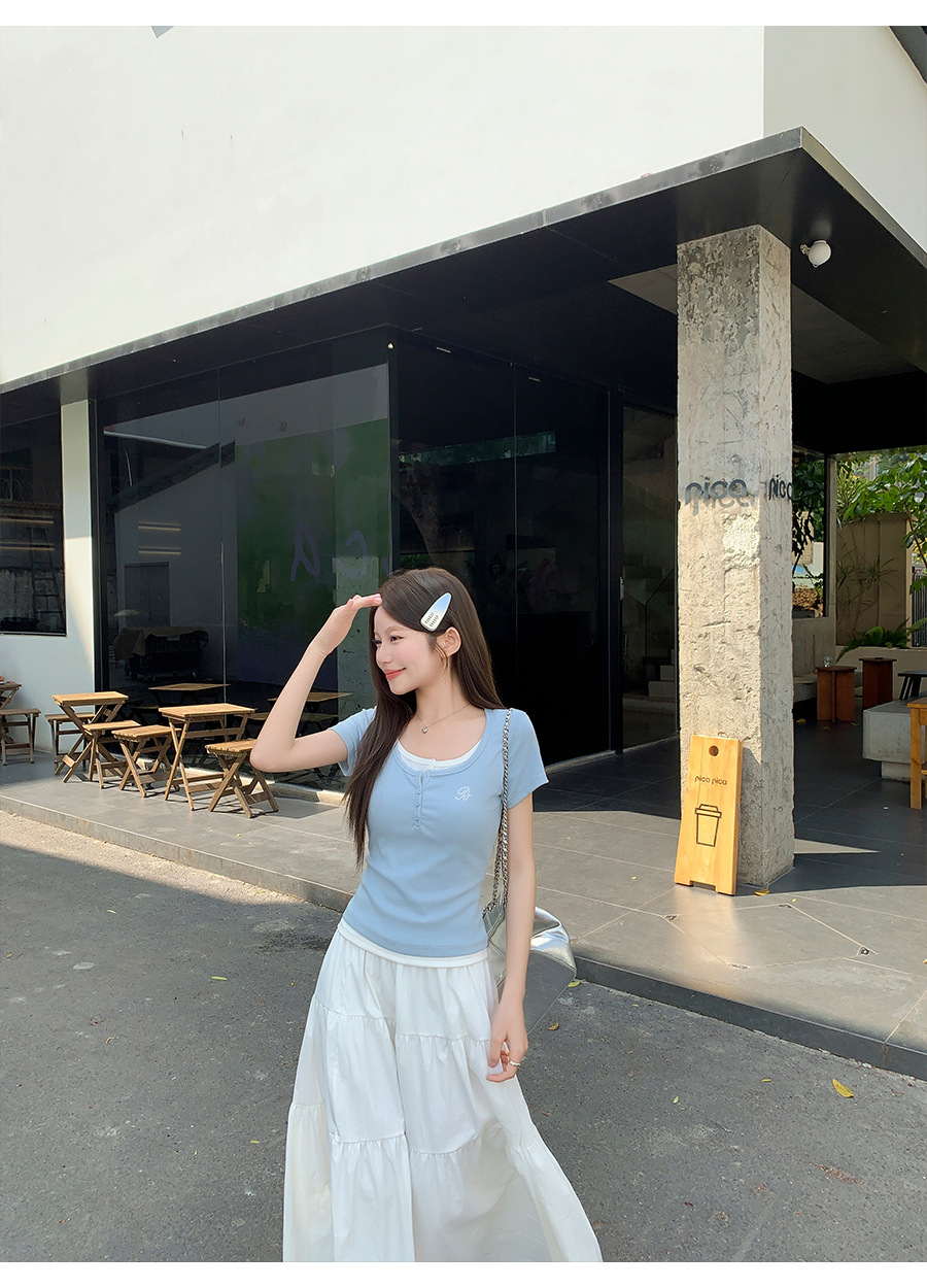 리얼 샷 디자인 센스 U 칼라 가짜 투피스 반팔 티셔츠 여성용 2025 년 여름 새로운 슬림 핏 슬림 핏 쇼트 탑