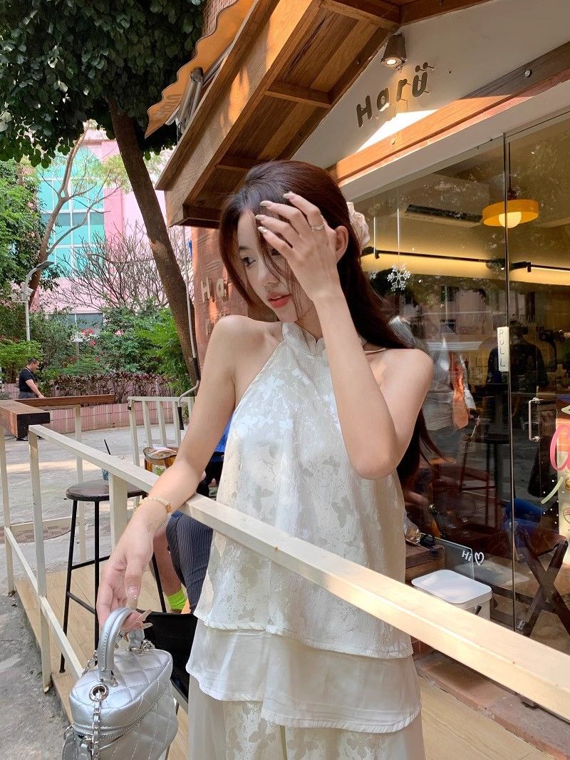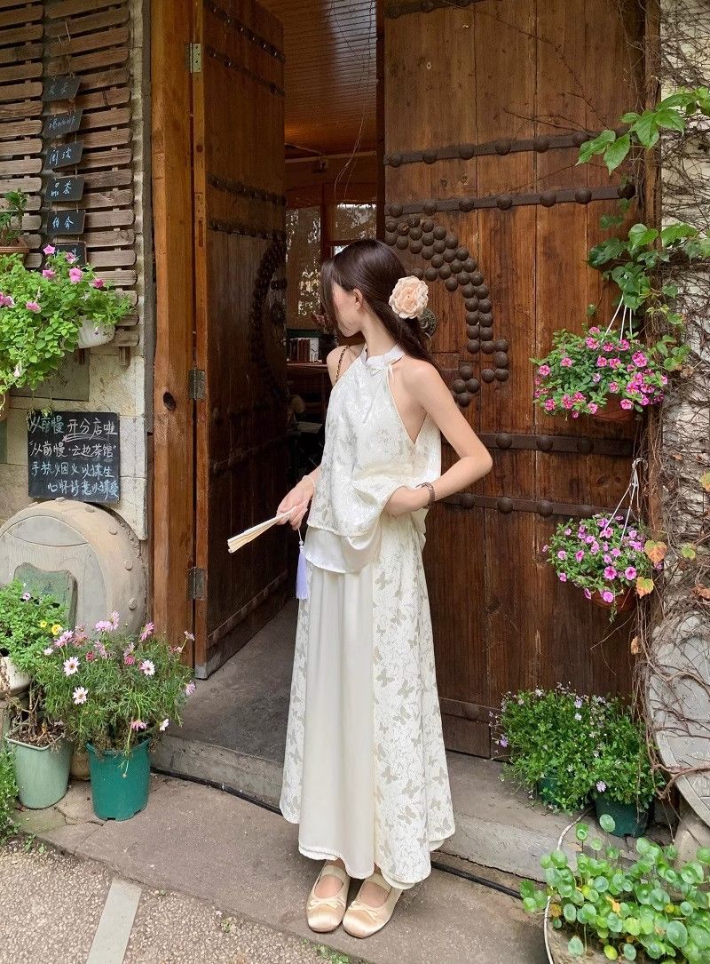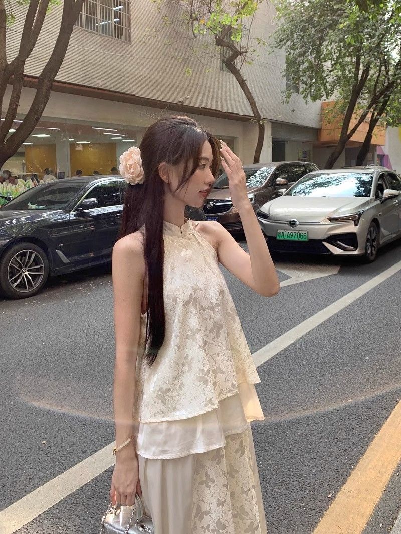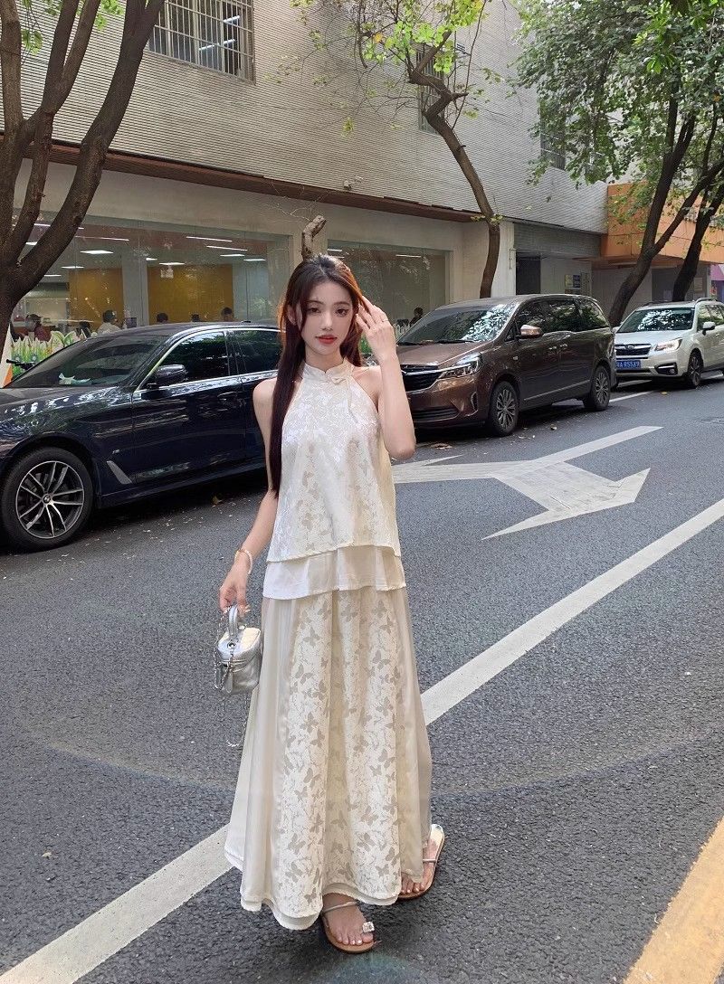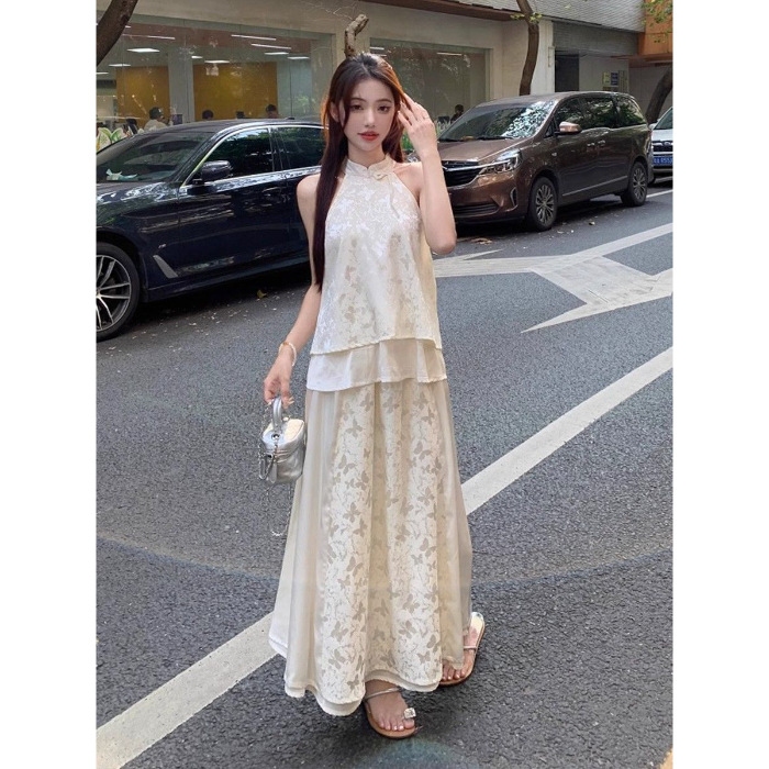 새로운 중국 스타일 국가 스타일 청삼 시원한 느낌 선 교수형 목 탑 하프 스커트 세트를 입고 여자 여름 세트