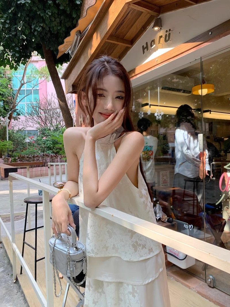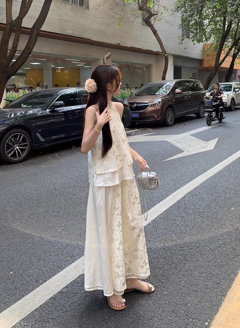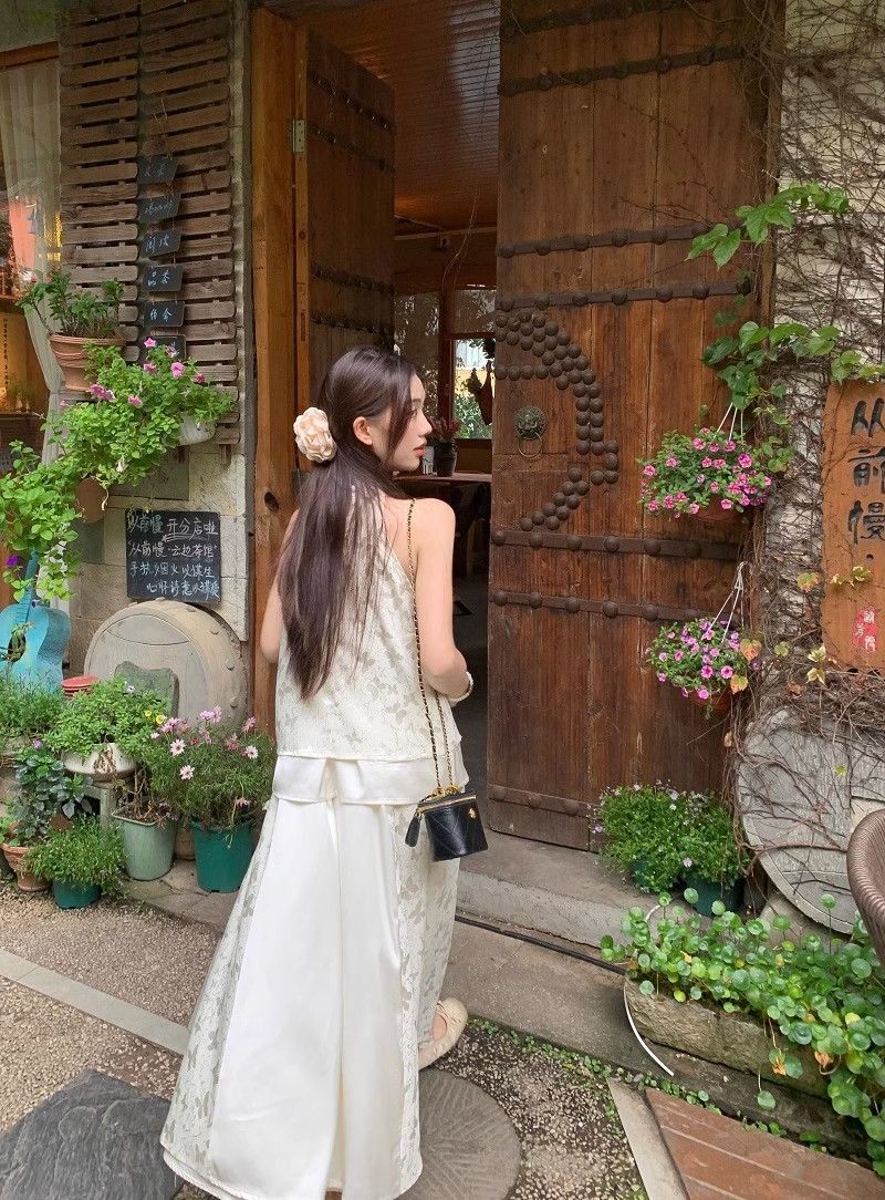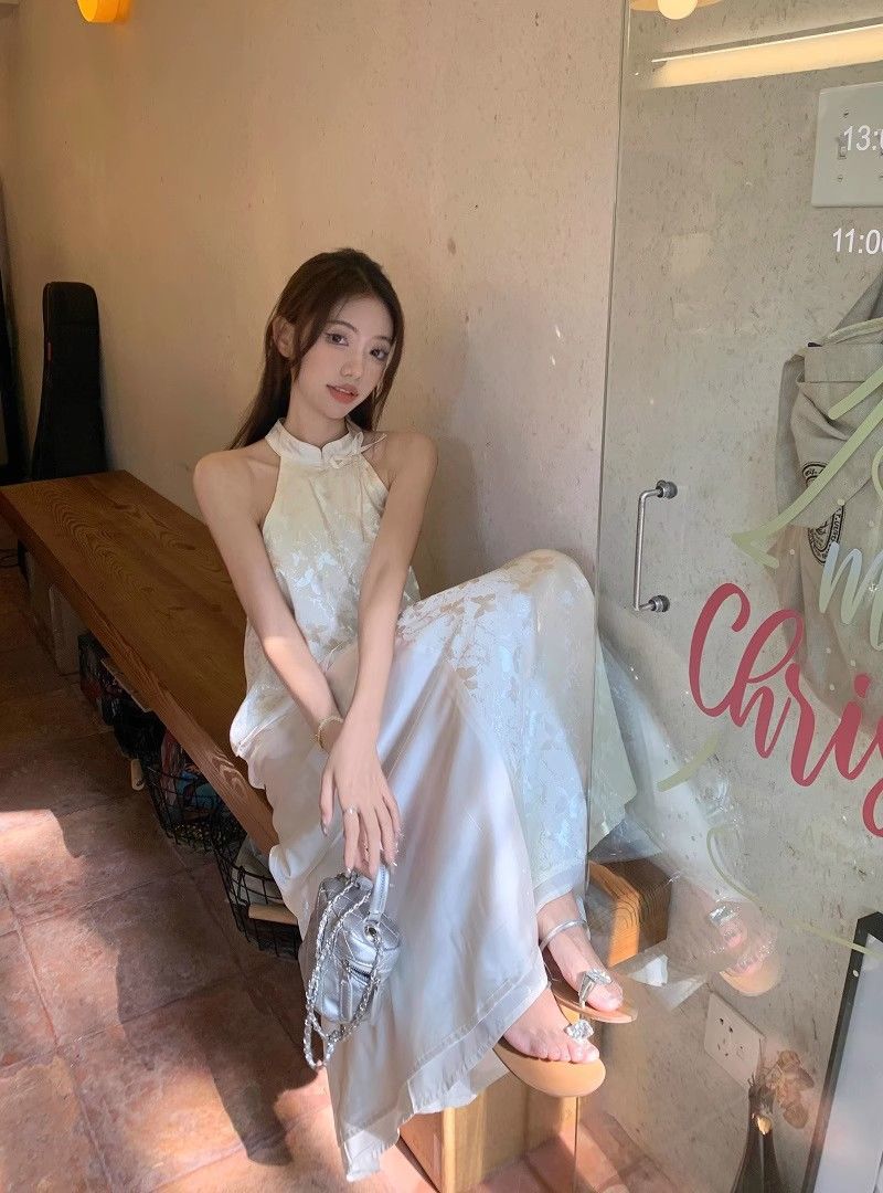 새로운 중국 스타일 국가 스타일 청삼 시원한 느낌 선 교수형 목 탑 하프 스커트 세트를 입고 여자 여름 세트
