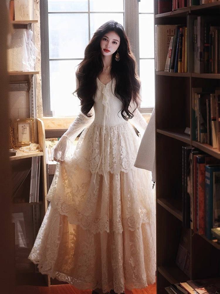 프랑스 레트로 라이트 웨딩 원피스 레이스 케이크 스커트 중공업 V-Neck 원피스 우아한 기지 긴 스커트 대형 스커트스토어 가기