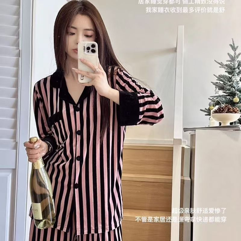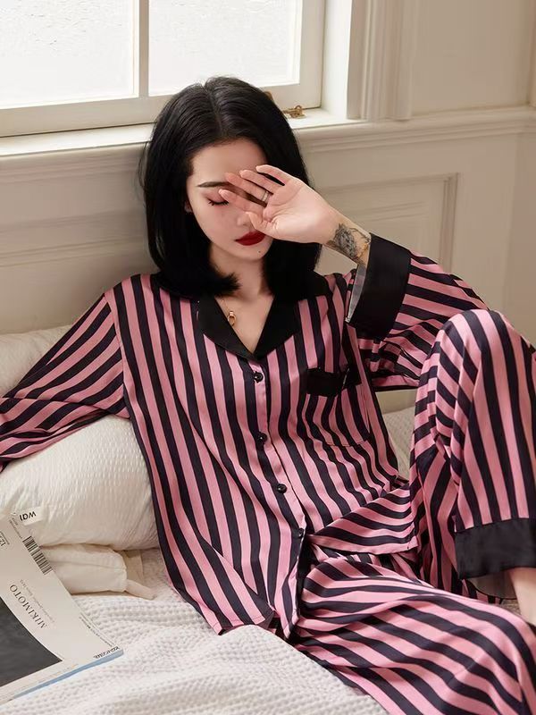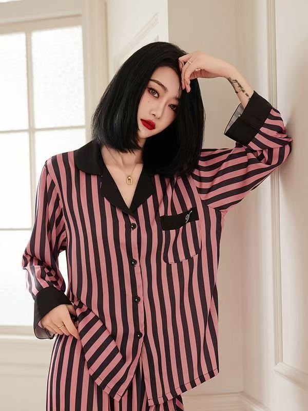 새로운 스타일 줄무늬 잠옷 여성의 봄과 가을 긴 소매 아이스 실크 세트 여름 옷깃 실크 카디건 홈 의류 여름 외부 착용스토어 가기