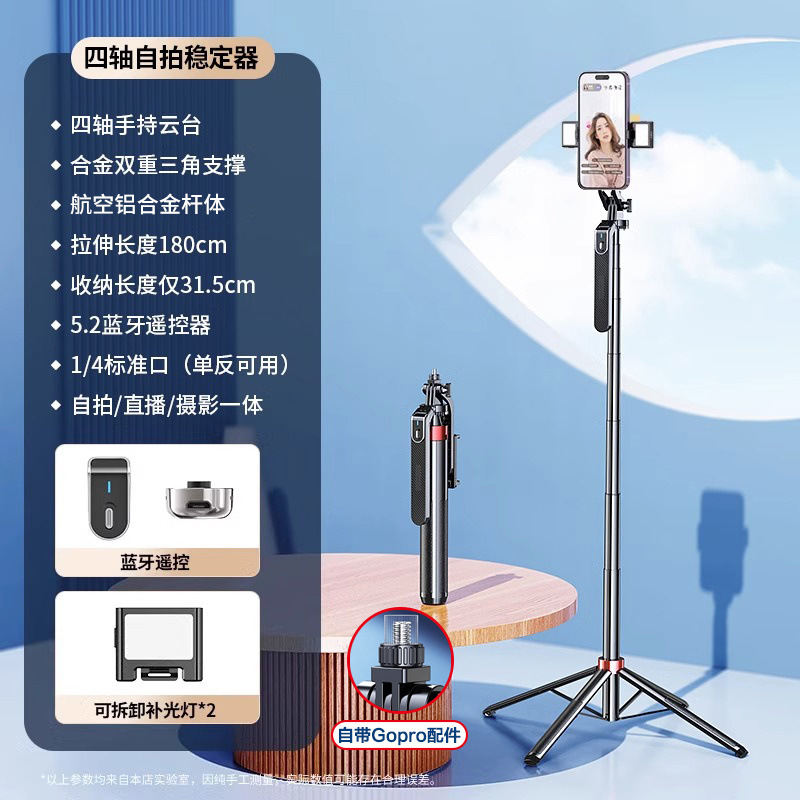 • [더블 립 스테인레스 스틸] Gopro/카메라와 호환 가능 - 1.8m [4축 손떨림 방지 모델] 휴대용 짐벌 - 듀얼 라이트