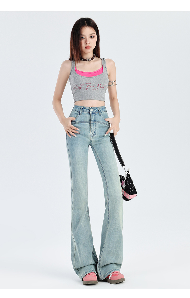 라이트 컬러 마이크로 플라 드 청바지 여성의 2025 봄 새로운 높은 허리 슬리밍 작은 뜨거운 소녀 말굽 플래 팬츠