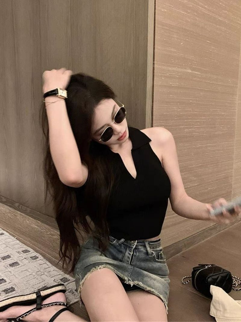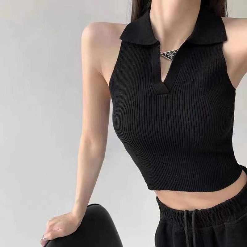 프랑스 스타일 폴로 넥 니트 카미 솔 여성용 여름 외부 착용 민소매 베이스 달콤한 스파이스 소녀 짧은 내부 교수형 목 탑