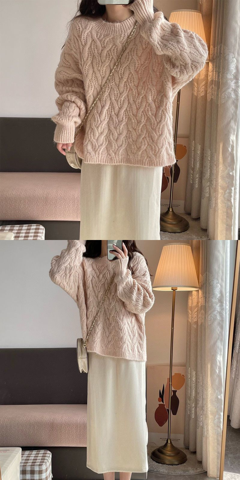 • [세트] 핑크색 스웨터 + 화이트 스커트
