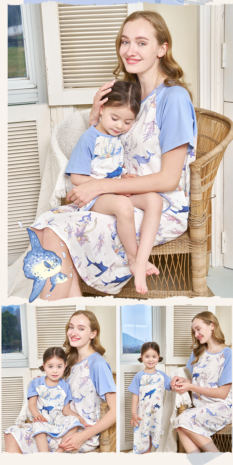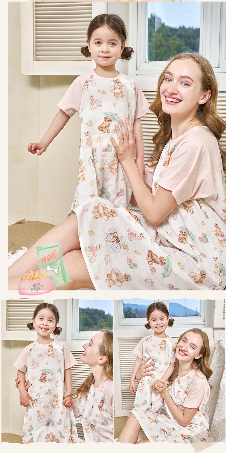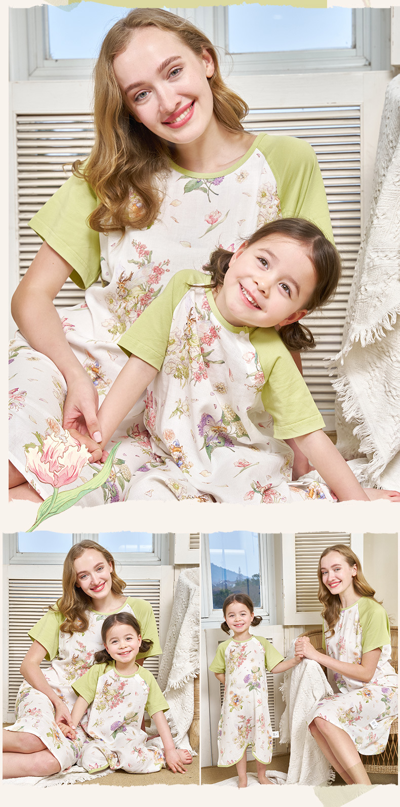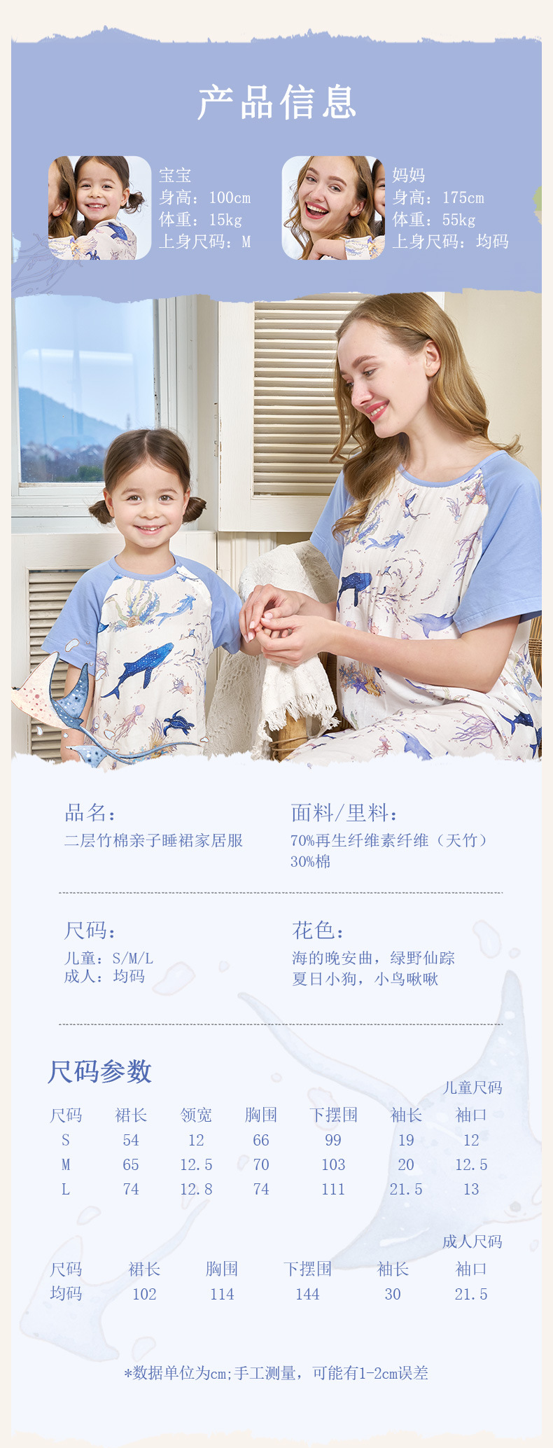 안단 봄여름 대나무면 거즈 아동용 침낭 여름용 얇은 부모-자녀 잠옷 원피스 부모-자녀 홈웨어 통기성