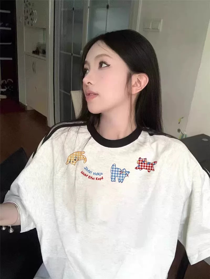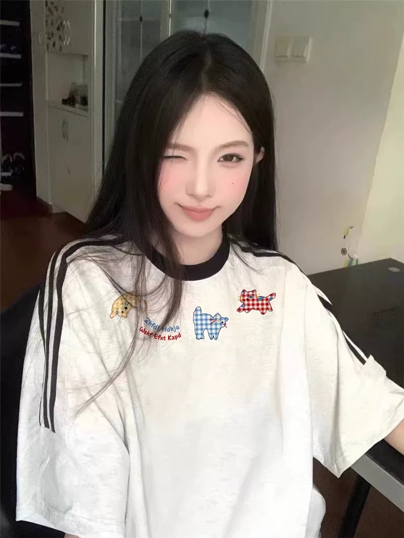 퓨어 코튼 반팔 티셔츠 여성용 여름 통통녀 3 바 스트라이프 디자인 센스 틈새 미국 느슨한 반소매 탑 Ins스토어 가기