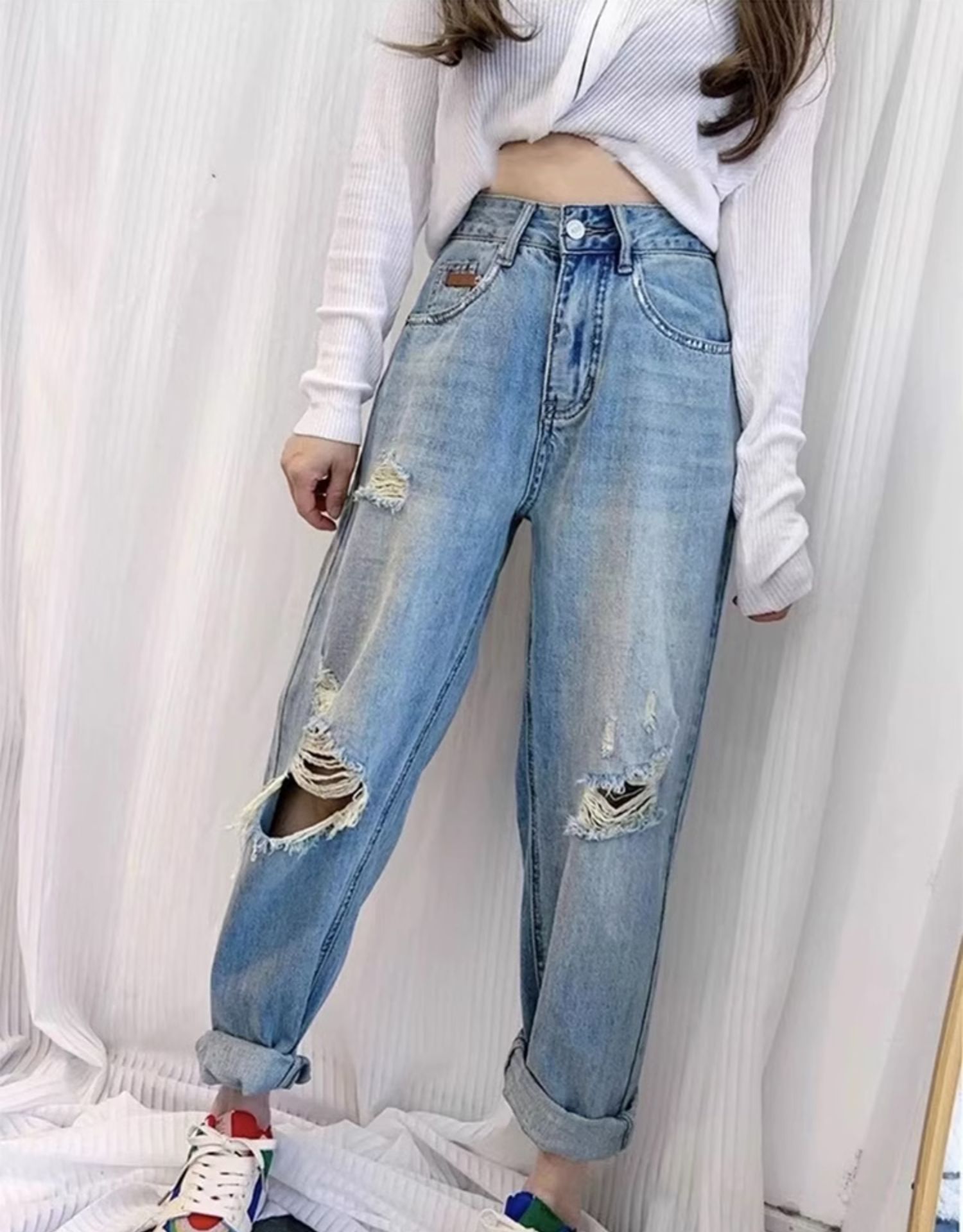 플러스 사이즈 스트레이트 청바지 여성용 2025 년 새 봄과 가을 통통녀 느슨한 높은 허리 슬리밍 아빠 하렘 바지