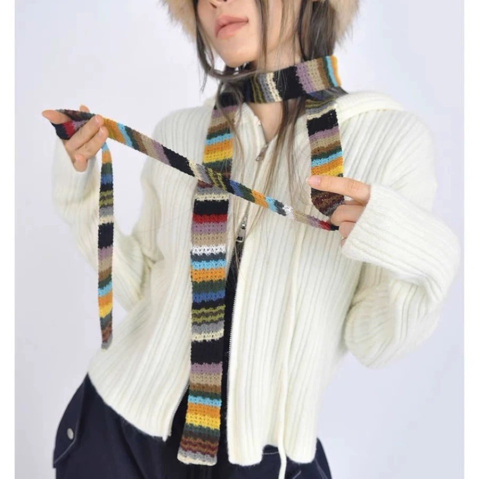 새로운 패브릭 복고풍 하라주쿠 스타일 무지개 직조 컬러 블록 긴 줄무늬 니트 스카프 여성용 얇은 스트립 스카프