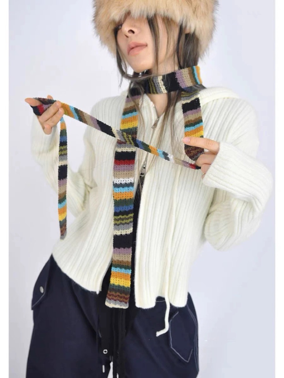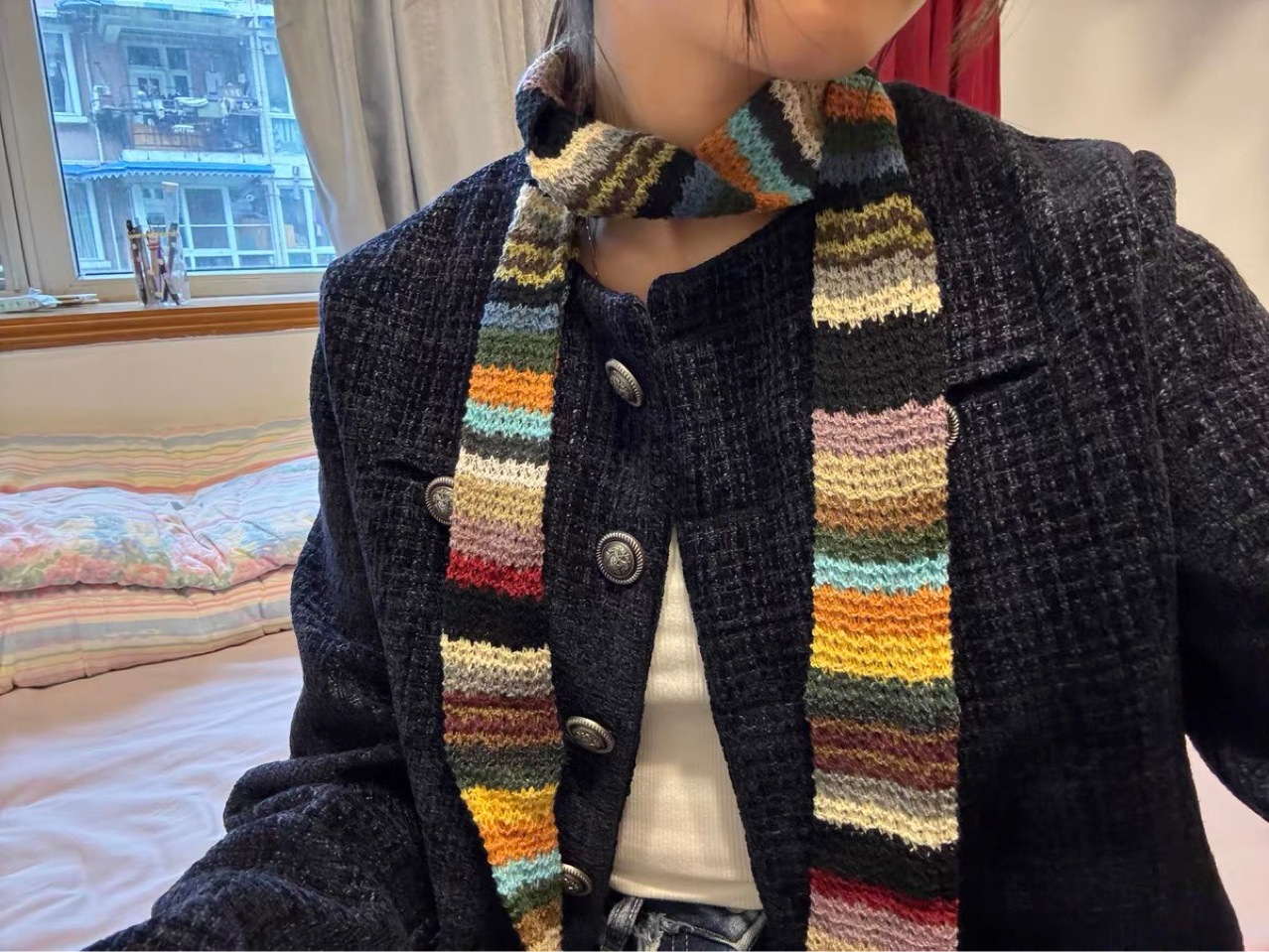 새로운 패브릭 복고풍 하라주쿠 스타일 무지개 직조 컬러 블록 긴 줄무늬 니트 스카프 여성용 얇은 스트립 스카프스토어 가기