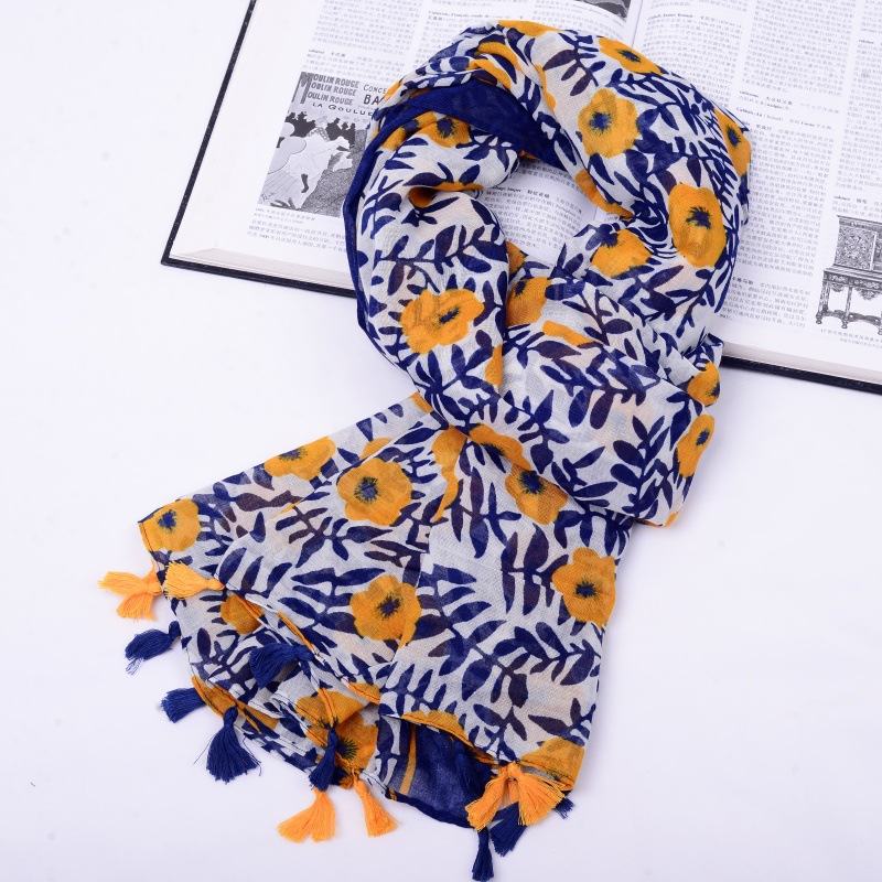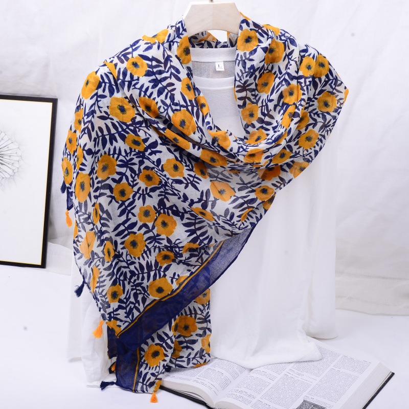 여성을위한 새로운 대외 무역 스카프 봄과 여름 면화와 린넨 느낌의 긴 거즈 스카프 네이비 블루 오렌지 프린트 실크 스카프 여행 자외선 차단 숄스토어 가기