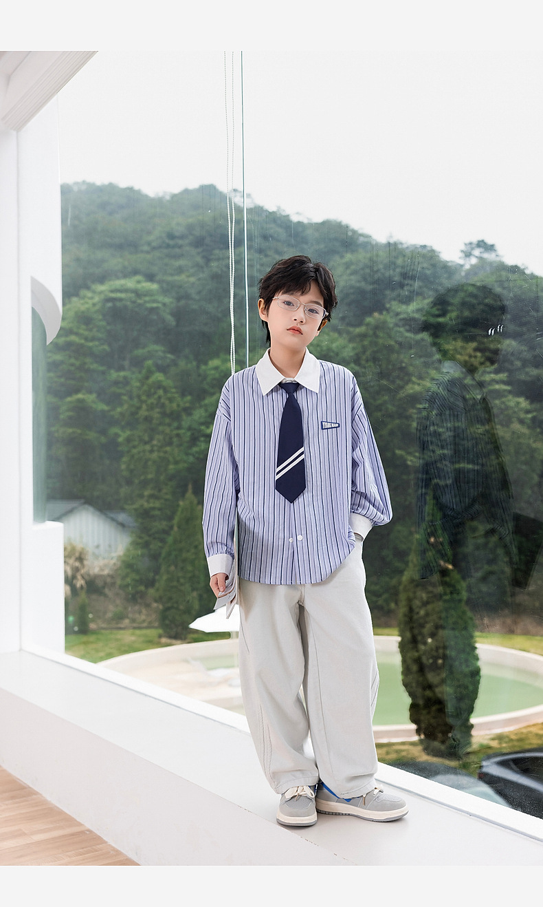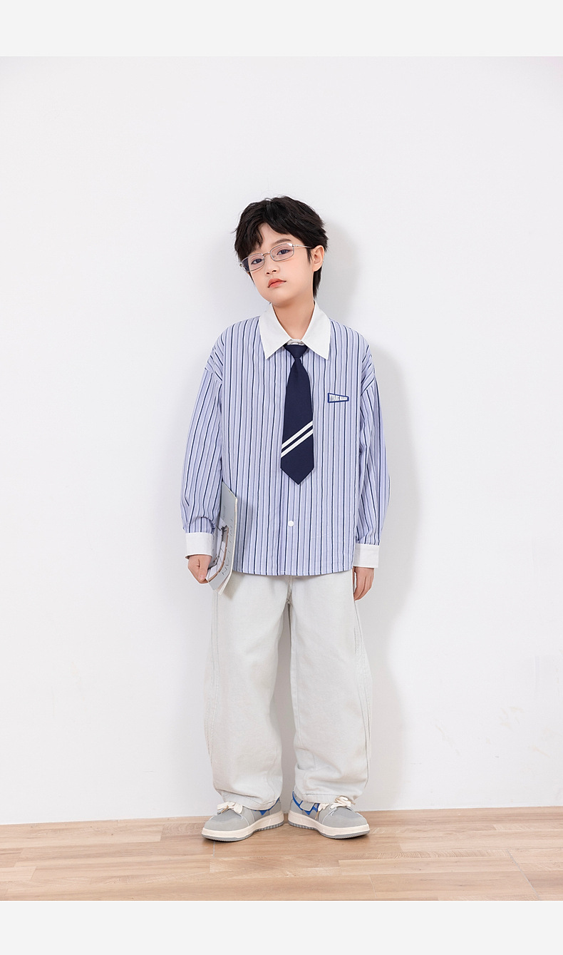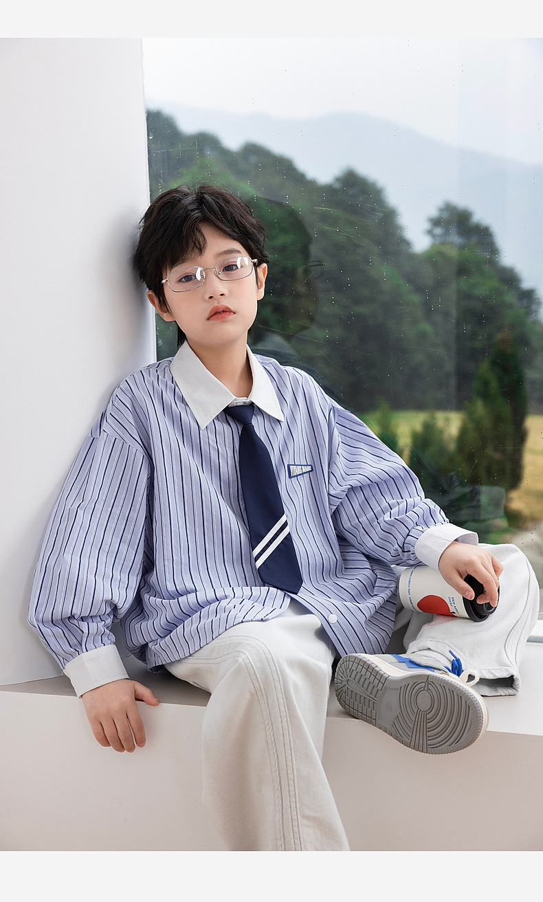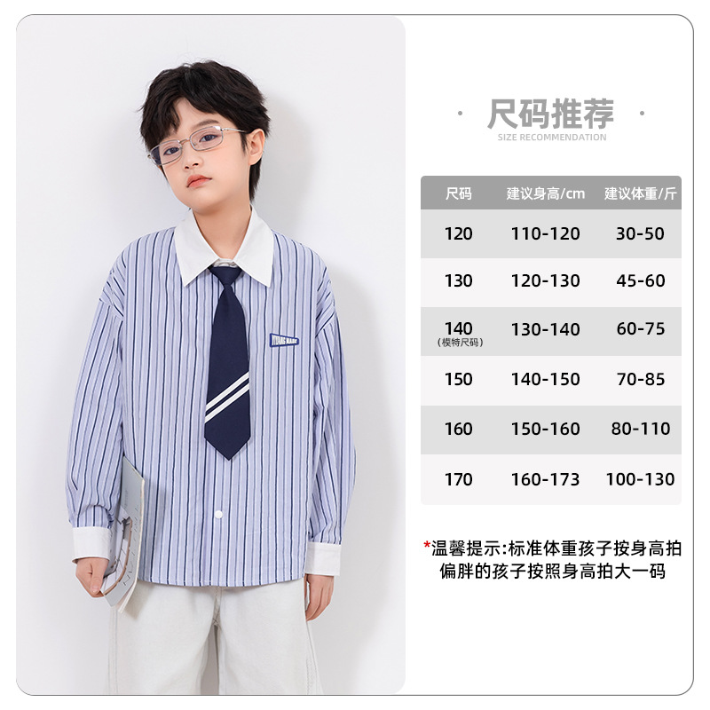 2025년 가을 신상 남아 스트라이프 셔츠 (넥타이 포함) 아동 긴팔 셔츠 봄 상의 제조업체 도매스토어 가기