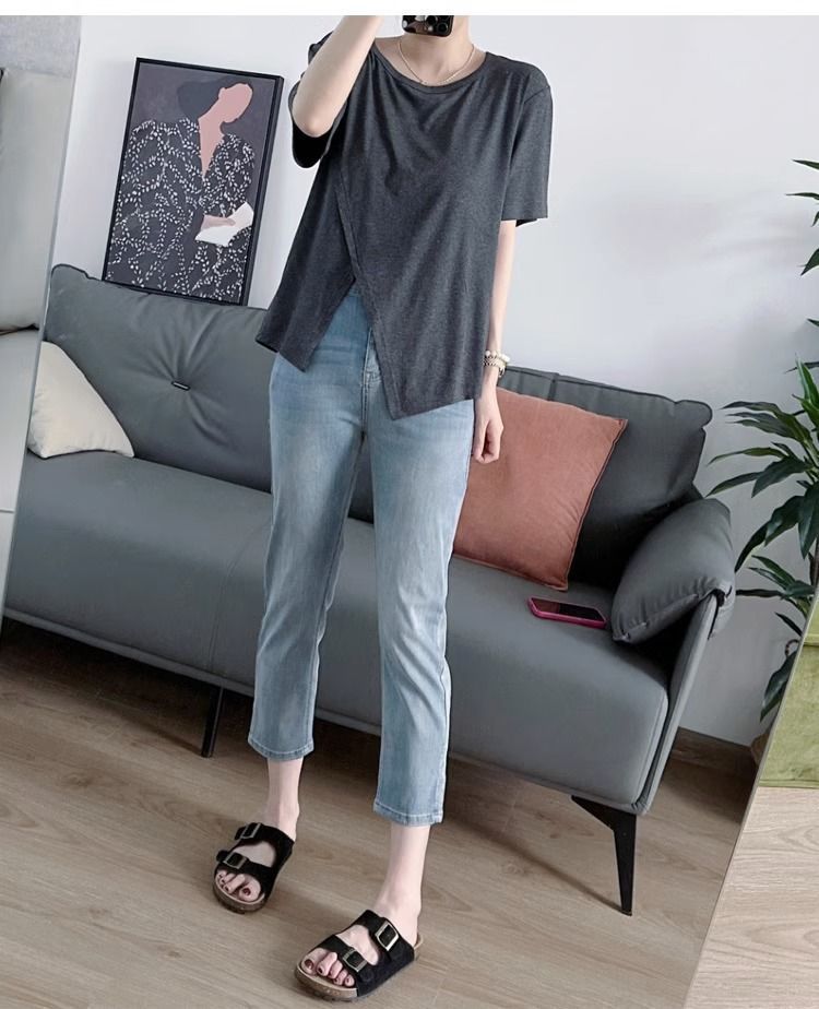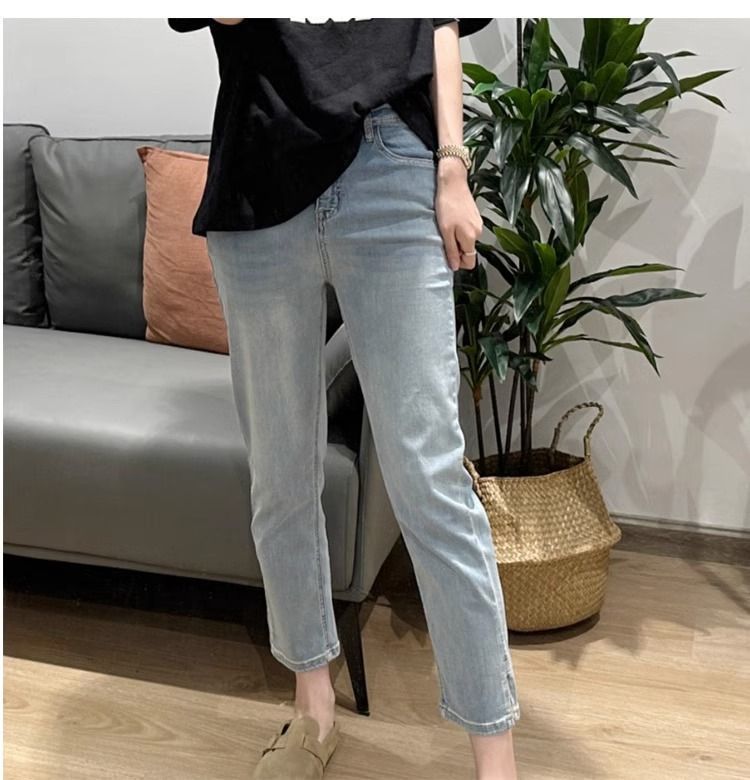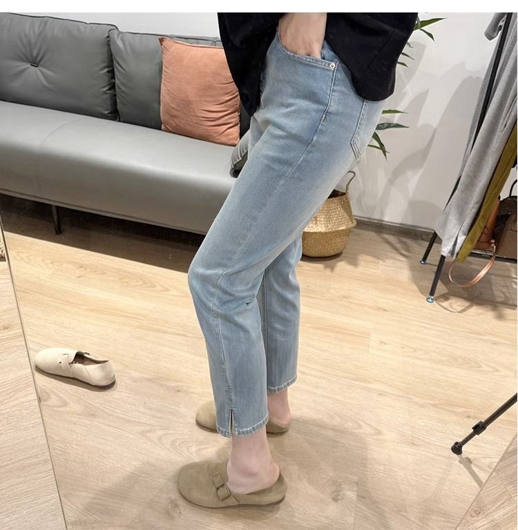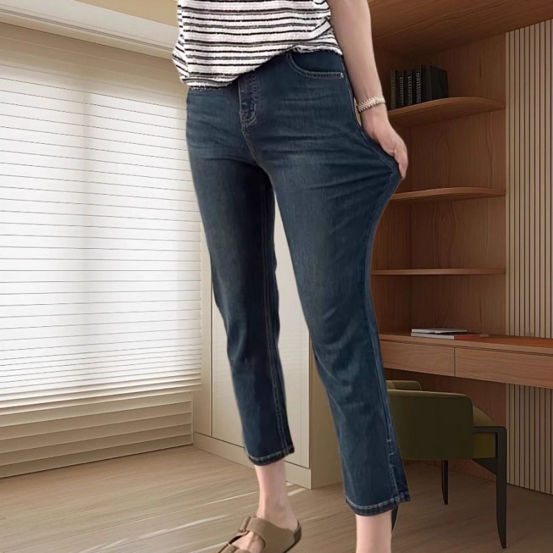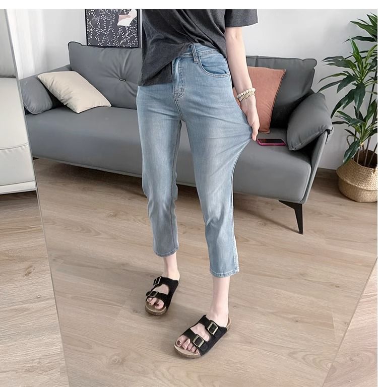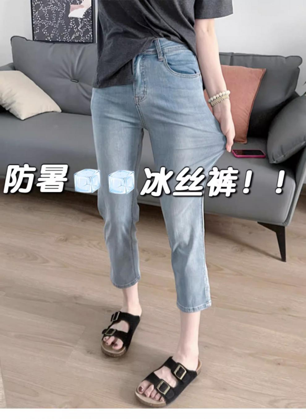 스트레치 아이스 실크 청바지 여성의 여름 새로운 부드러운 높은 허리 슬리밍 배 모양의 짧은 자른 스트레이트 바지스토어 가기