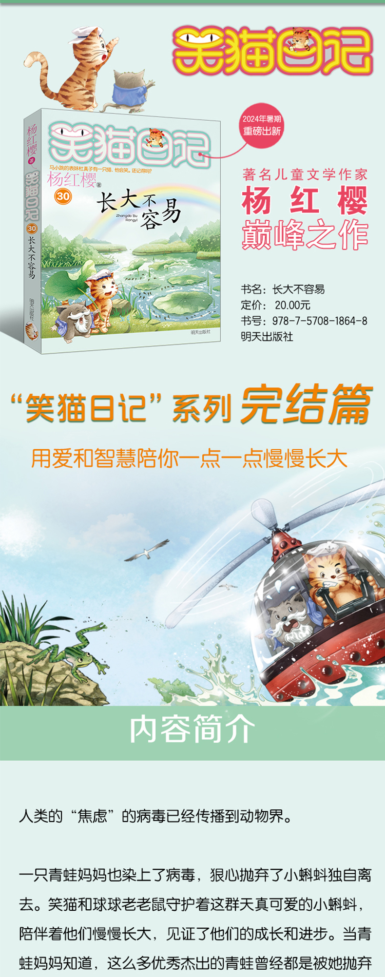 《长大不容易》是“笑猫日记”系列的第30册,作家杨红樱将持续关注中国儿童的现实生活状况和精神成长,为儿童抒写、抒情、抒怀。