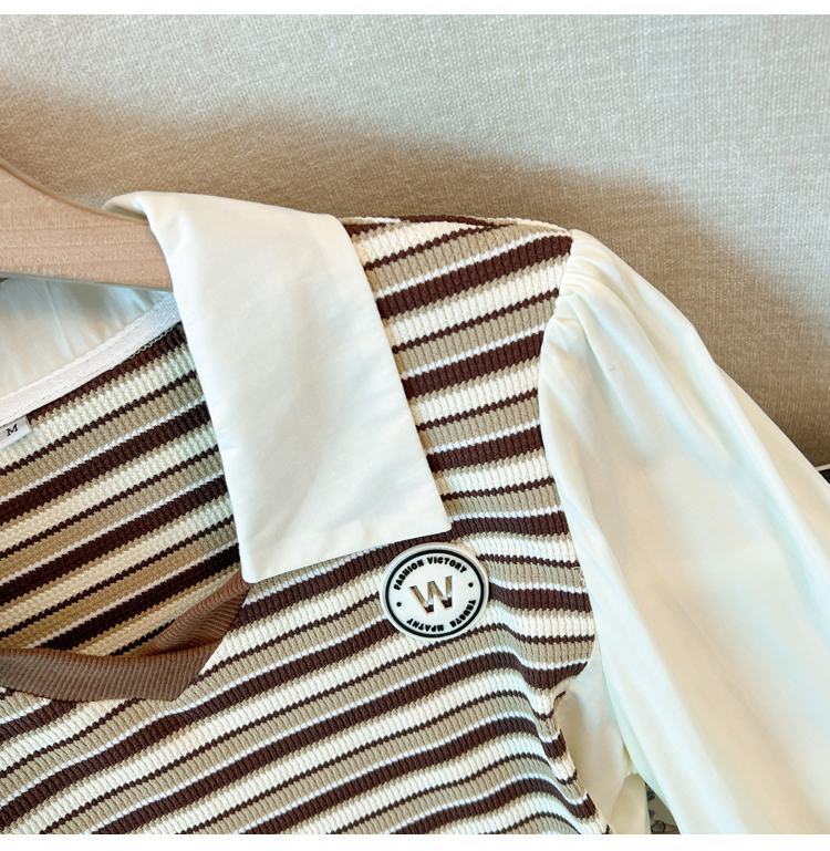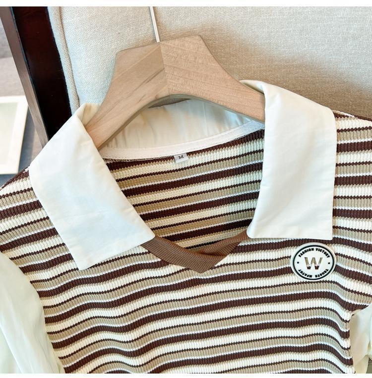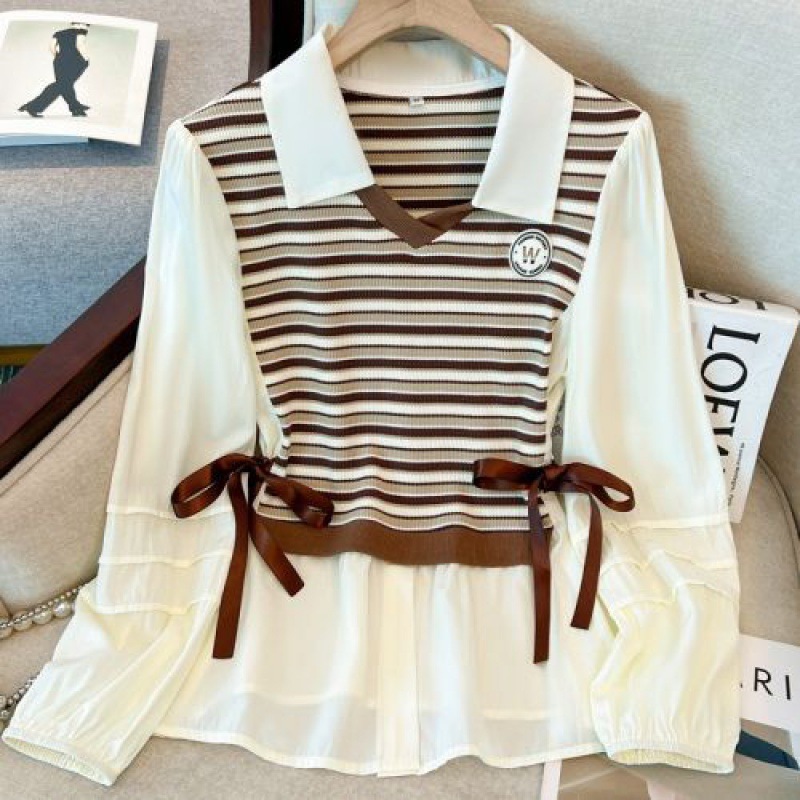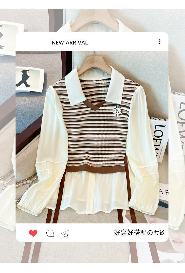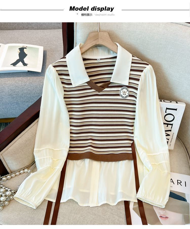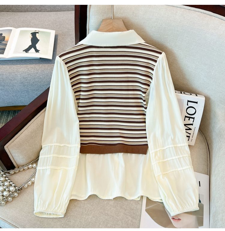 가을 2025 년 새로운 한국 스타일 가짜 두 조각 스티칭 반 오픈 칼라 셔츠 여성 디자인 틈새 캐주얼 탑