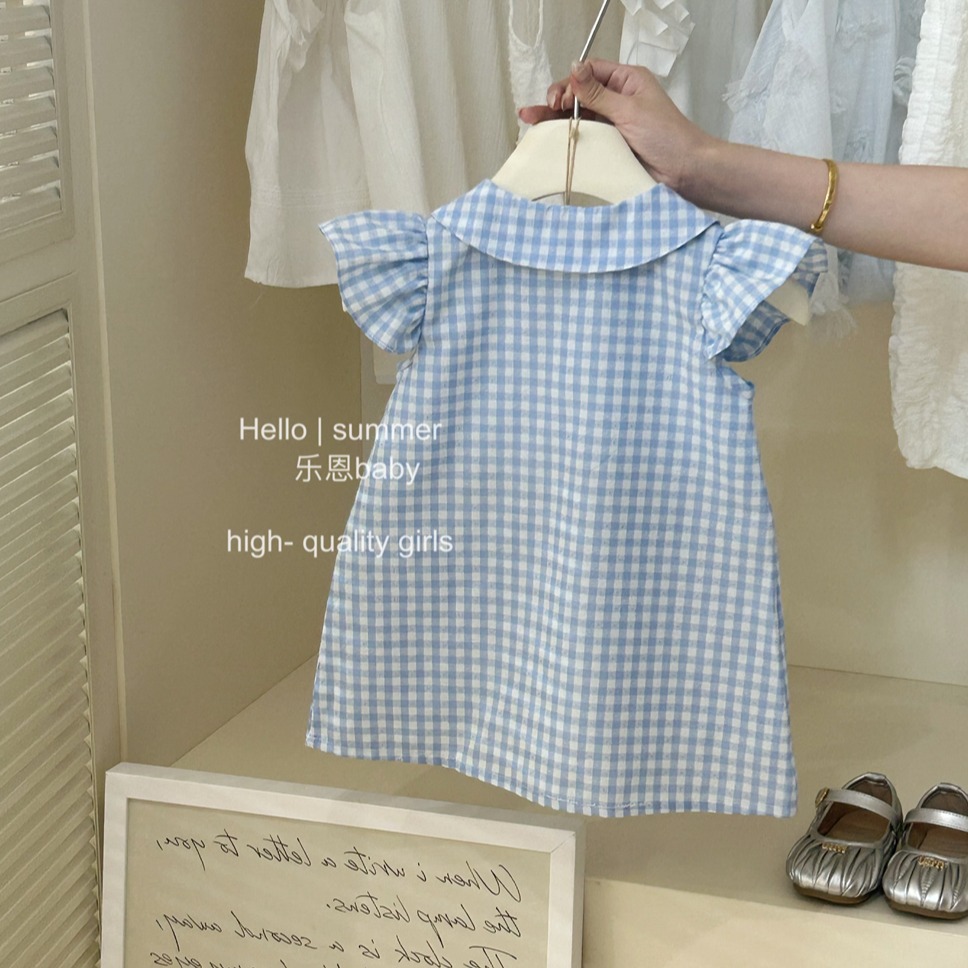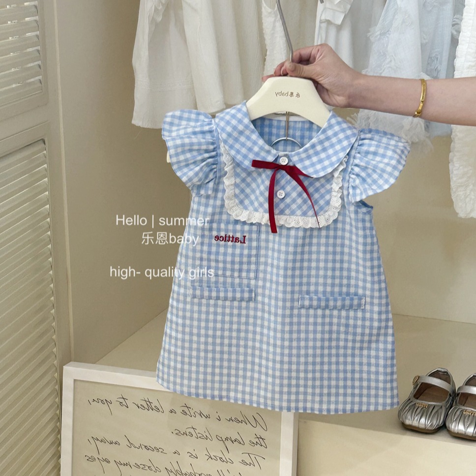 2025 소녀 대학 스타일 블루 체크 플라잉 슬리브 원피스 아기의 여름 한국 스타일 레이스 인형 원피스스토어 가기