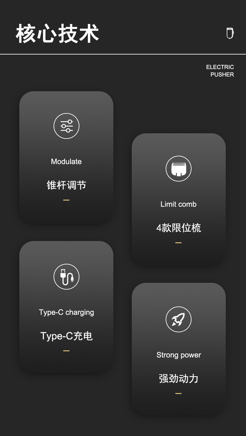 配件:限位梳*4(3/6/10/13mm),英文说明书,清洁刷,润滑油,type-c充电线1m