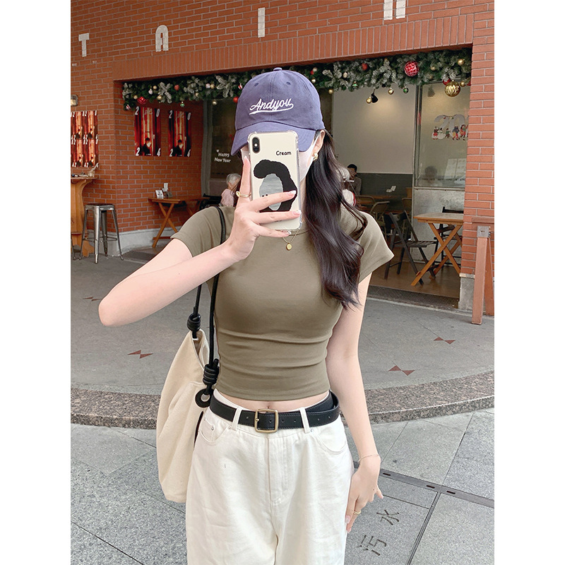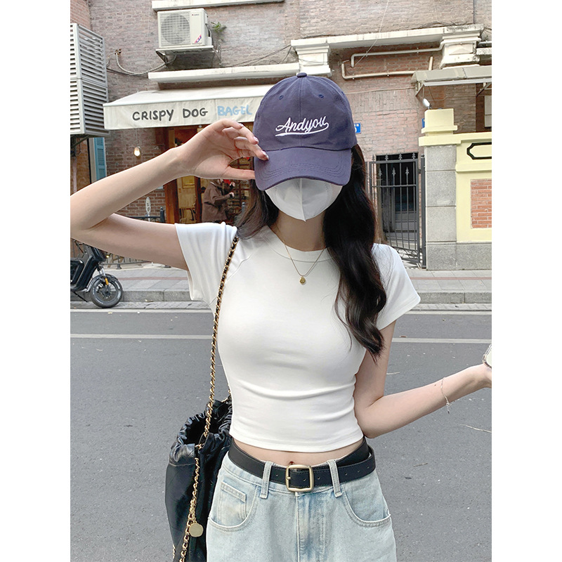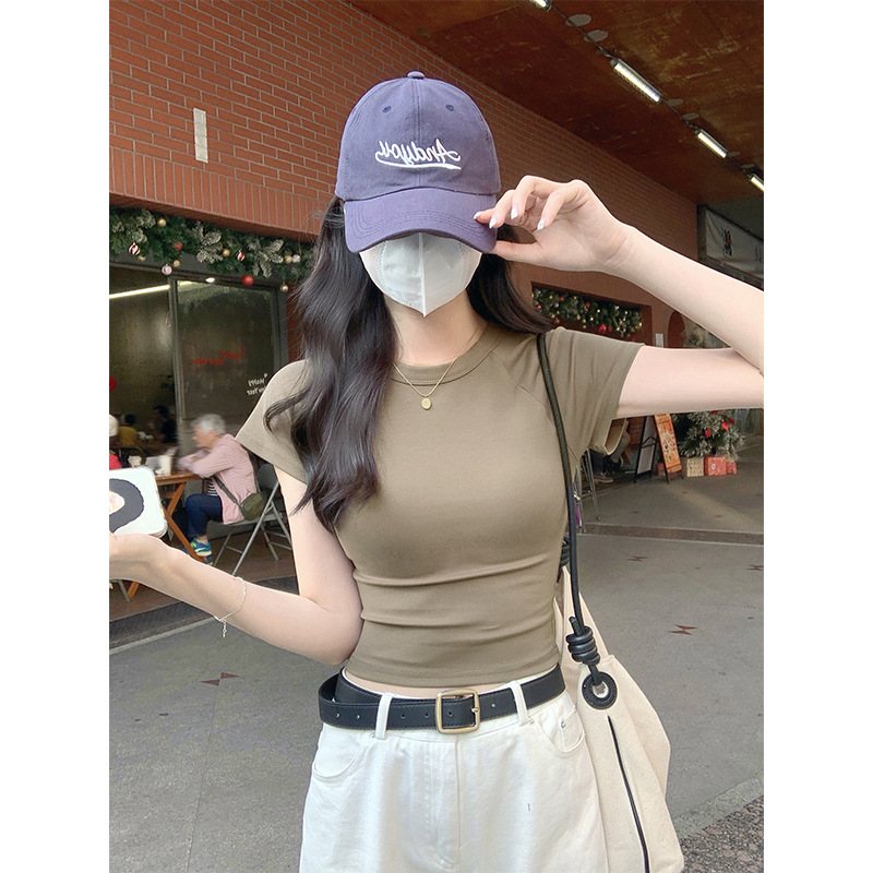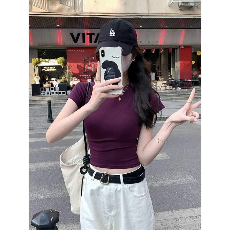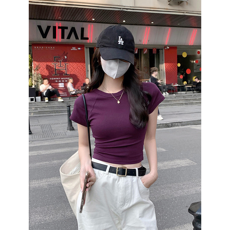 퍼플 코튼 반팔 티셔츠 여성용 2025 년 여름 새로운 슬림 핏 슬리밍 크루 넥 하이 엔드 숄더 티셔츠 탑스토어 가기