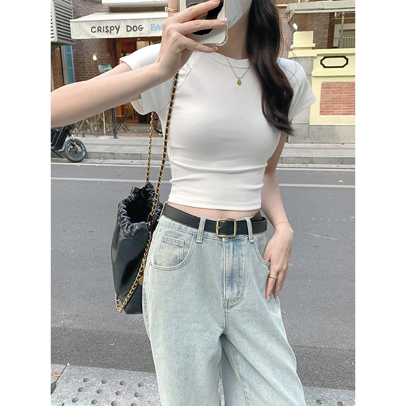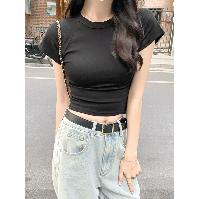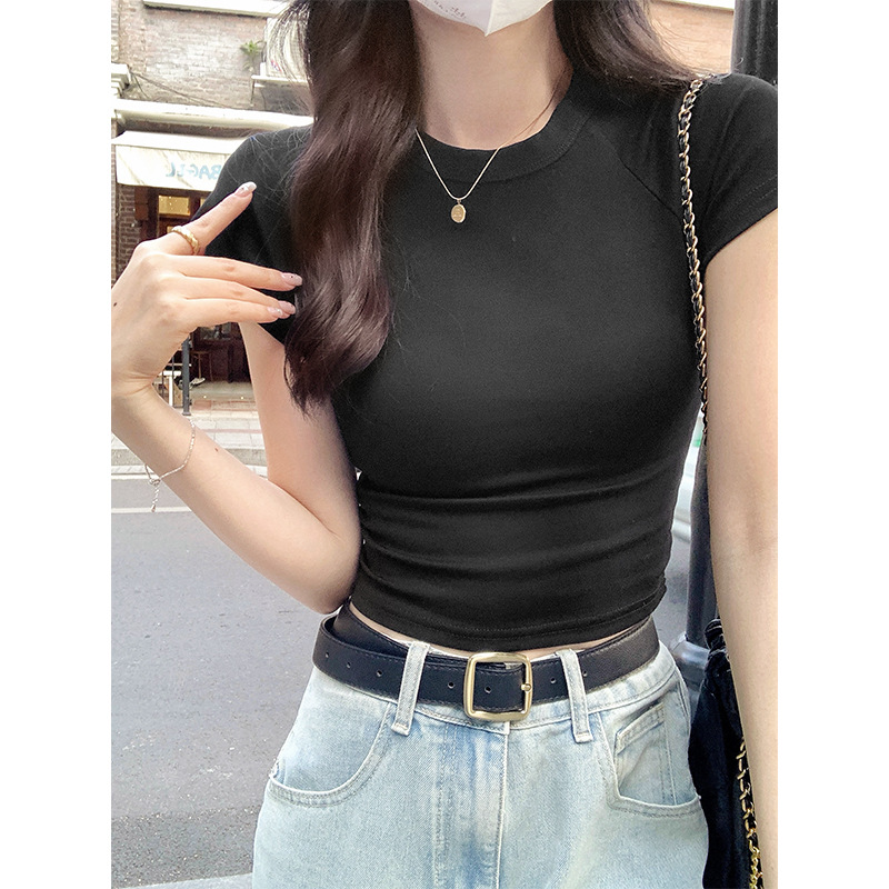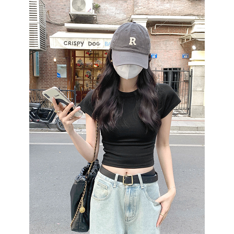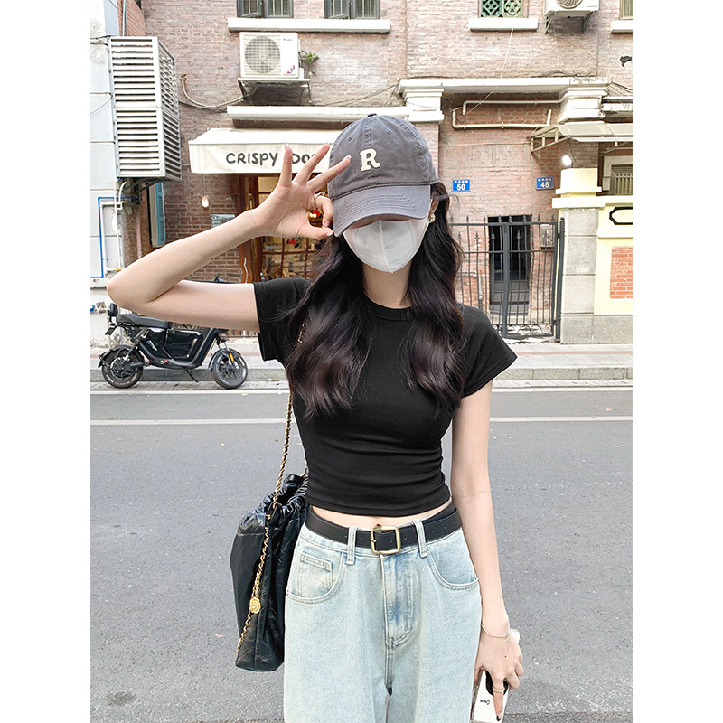퍼플 코튼 반팔 티셔츠 여성용 2025 년 여름 새로운 슬림 핏 슬리밍 크루 넥 하이 엔드 숄더 티셔츠 탑스토어 가기