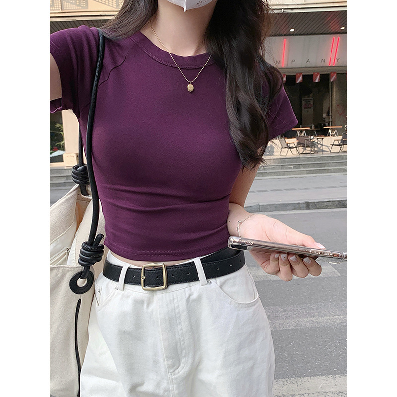 实拍实紫色纯棉短袖t恤女夏季修身显瘦圆领高级感正肩体恤上衣