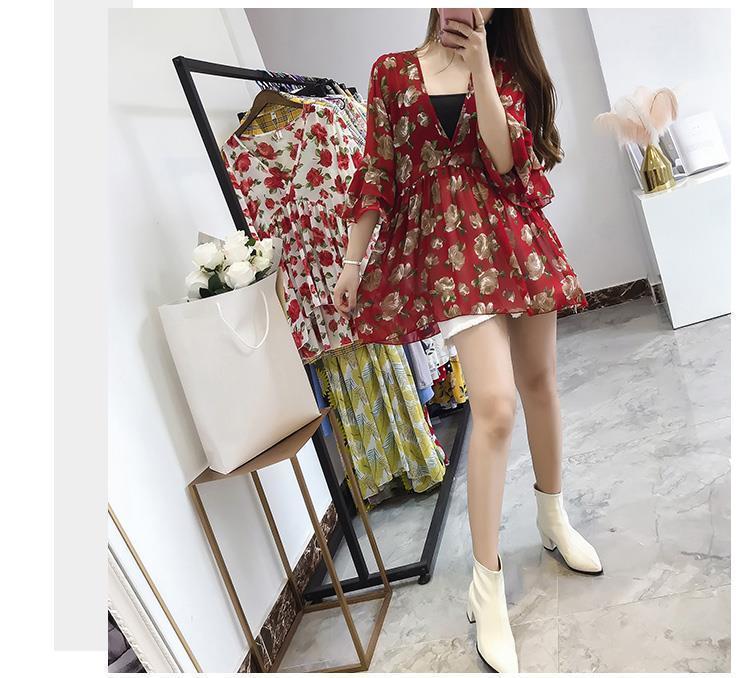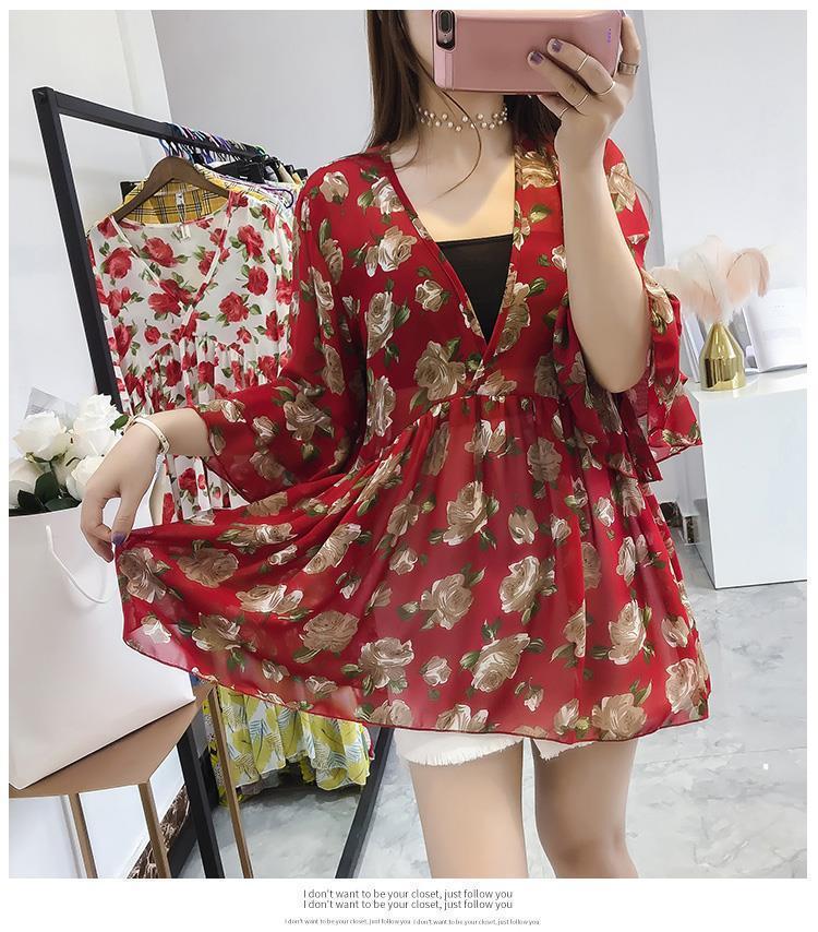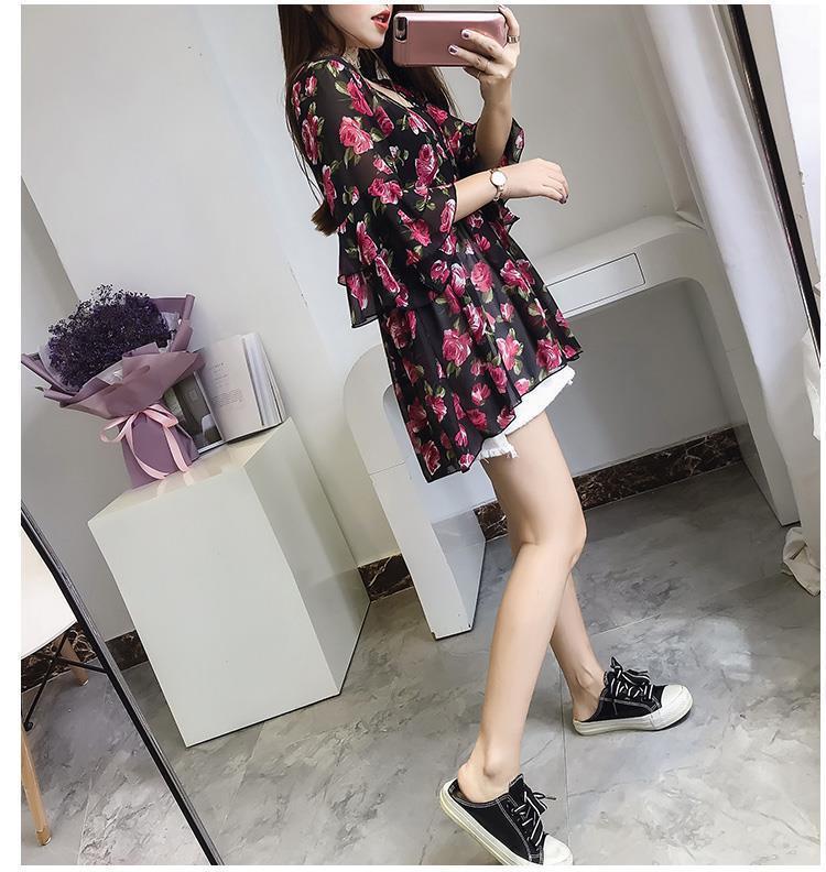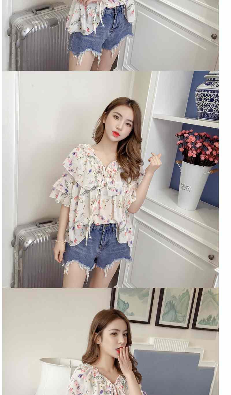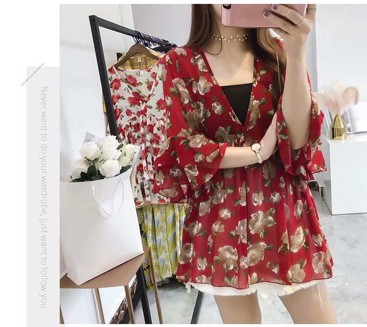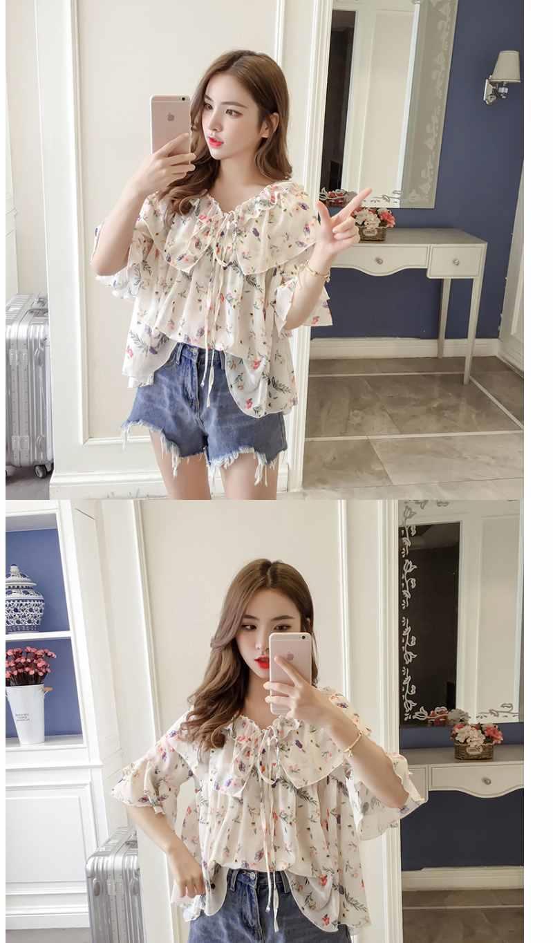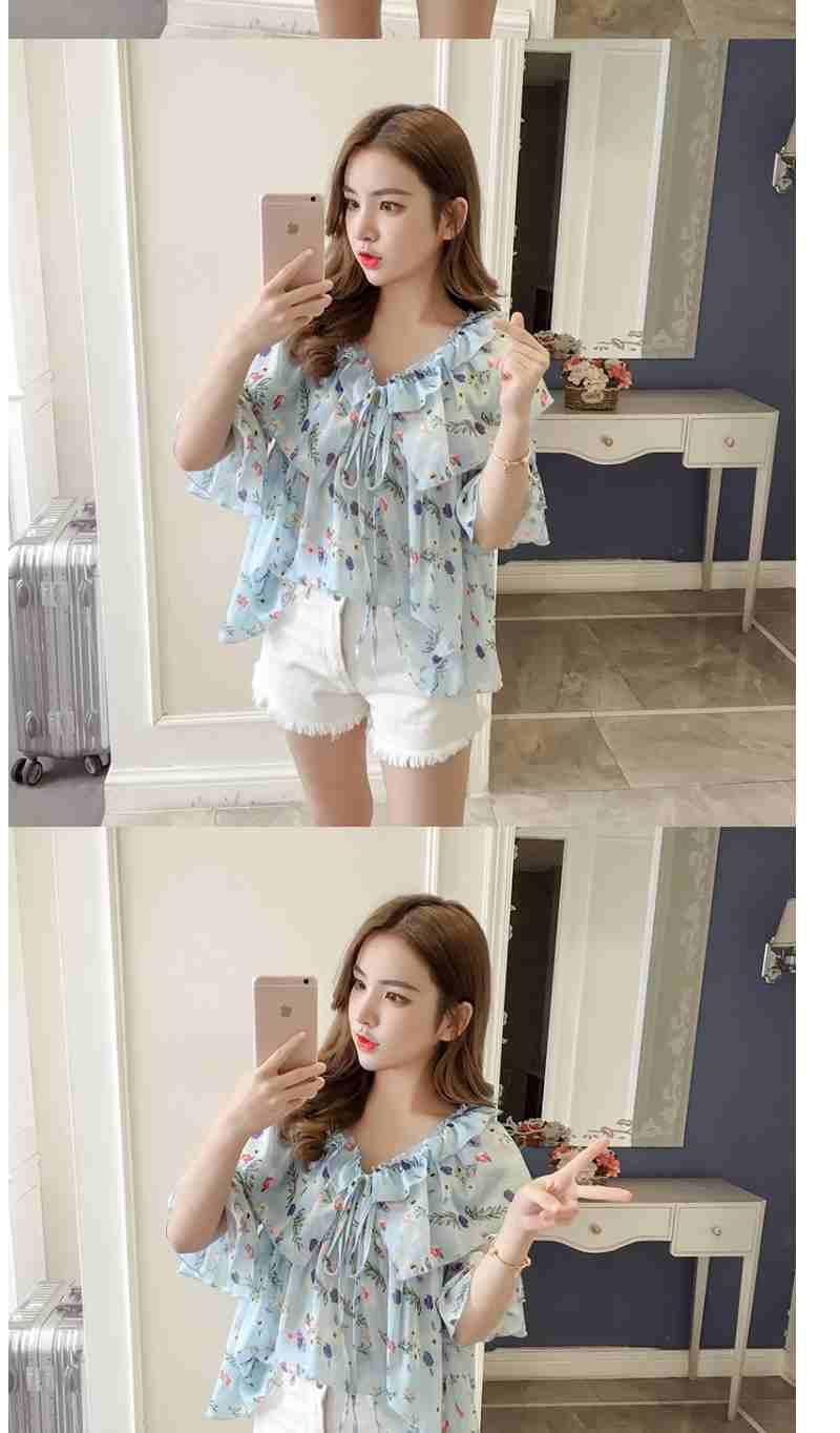 2024 여름 새로운 한국 스타일 달콤한 느슨한 꽃 셔츠 반팔 쉬폰 셔츠 여성용 슈퍼 요정 트럼펫 슬리브 트렌디 탑스토어 가기