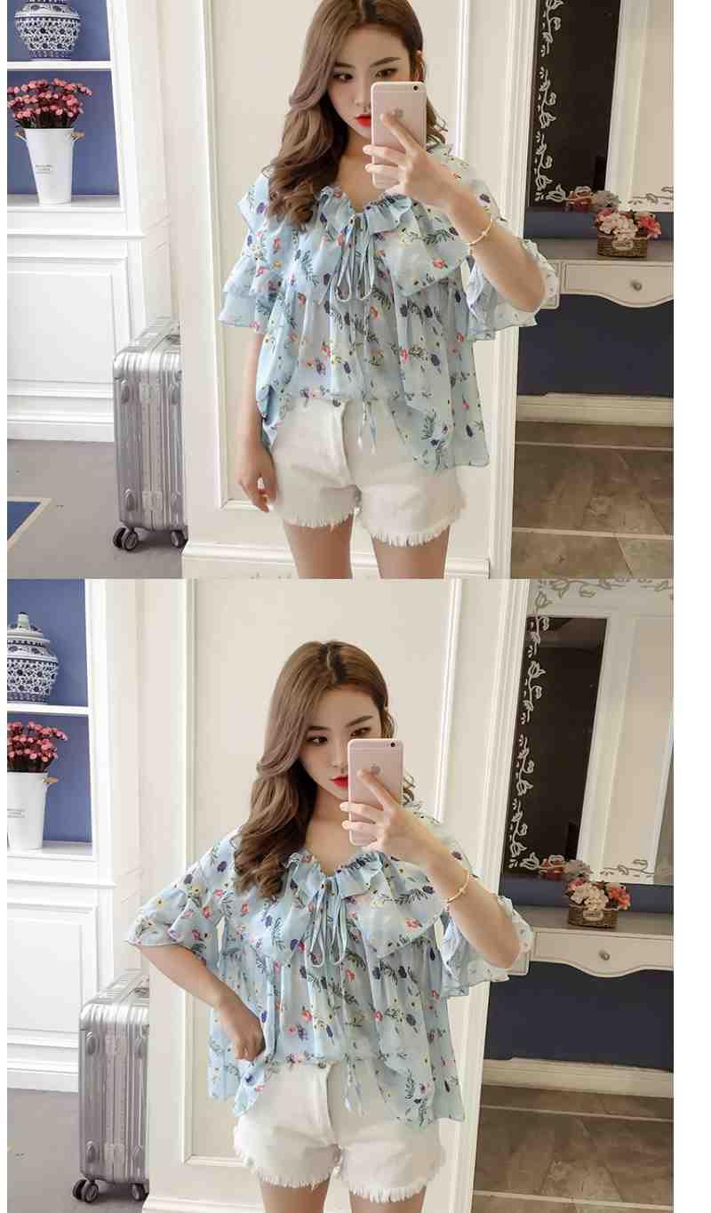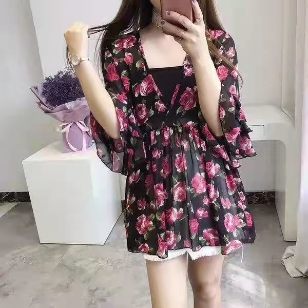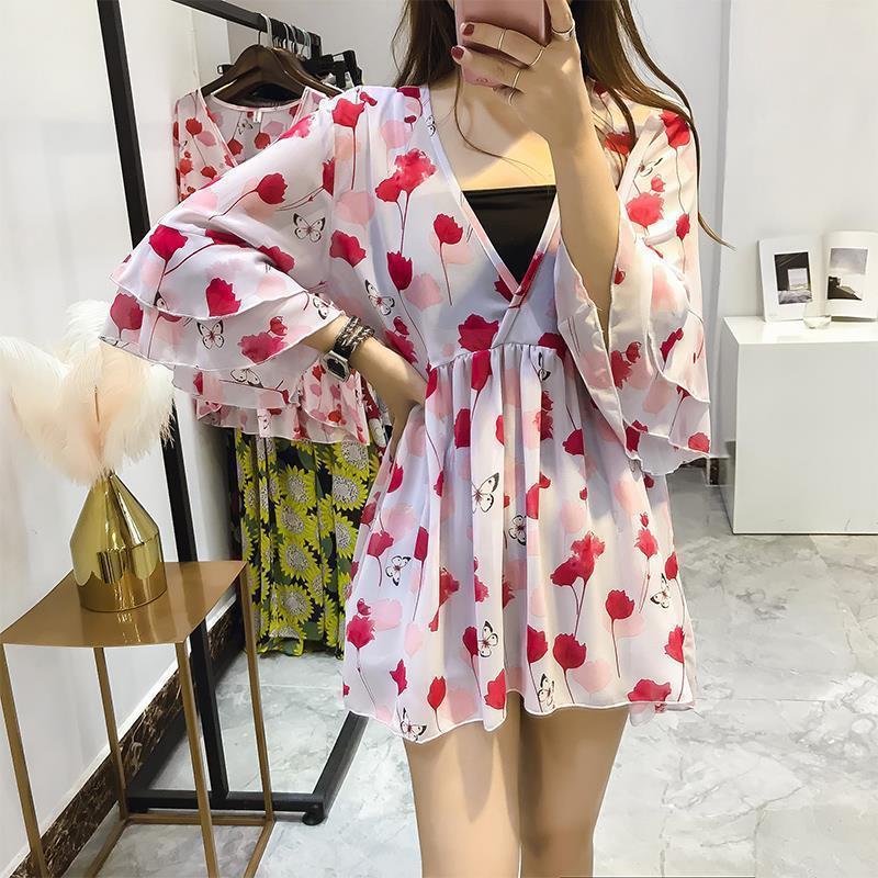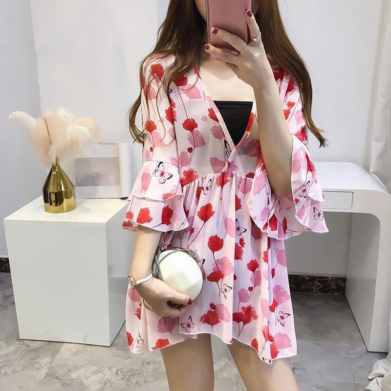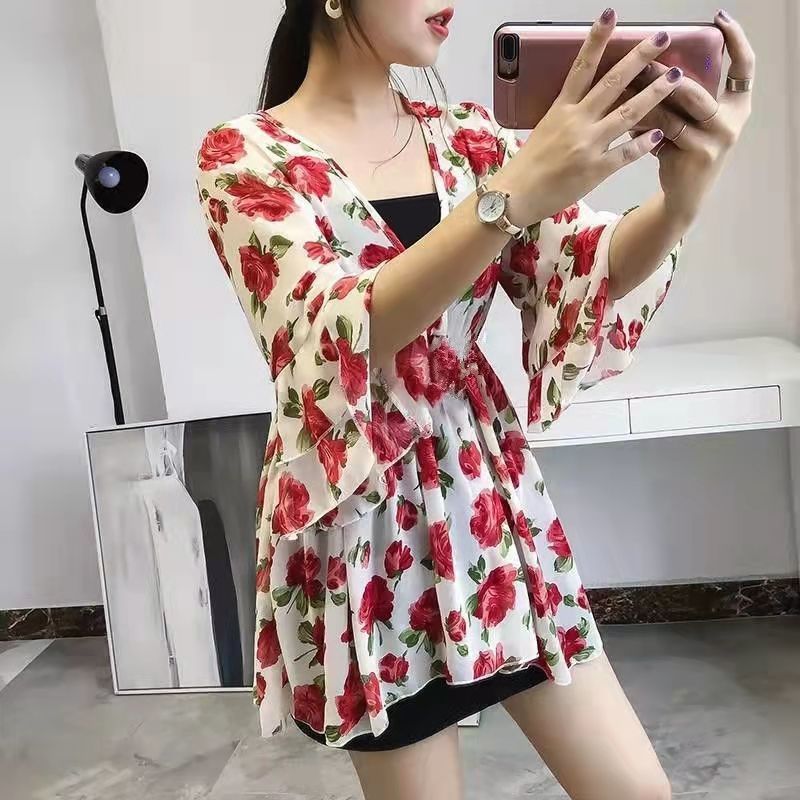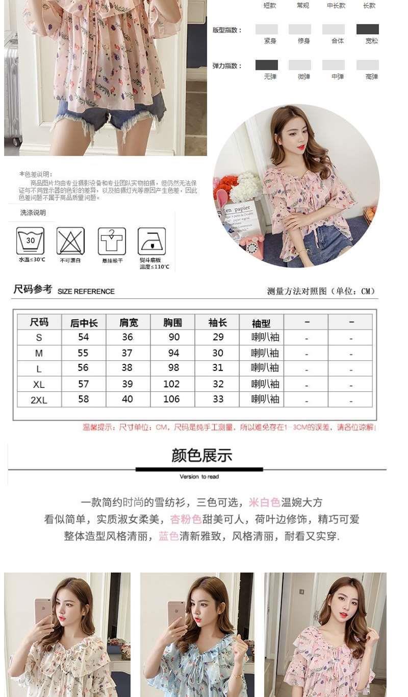 2024 여름 새로운 한국 스타일 달콤한 느슨한 꽃 셔츠 반팔 쉬폰 셔츠 여성용 슈퍼 요정 트럼펫 슬리브 트렌디 탑