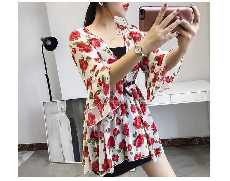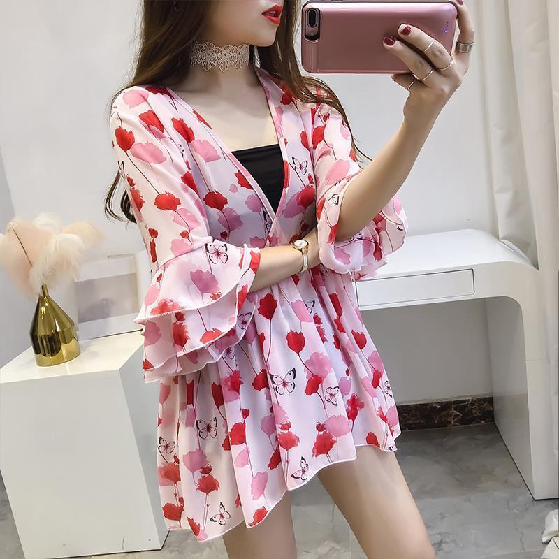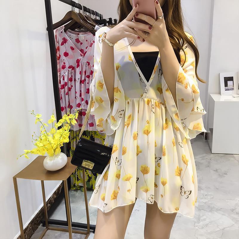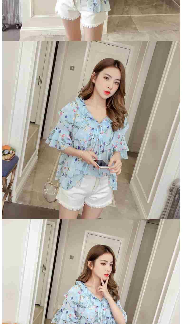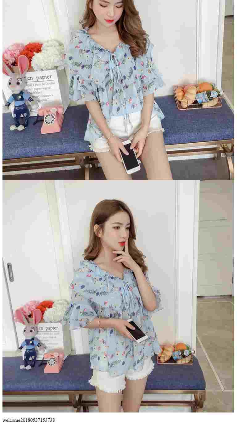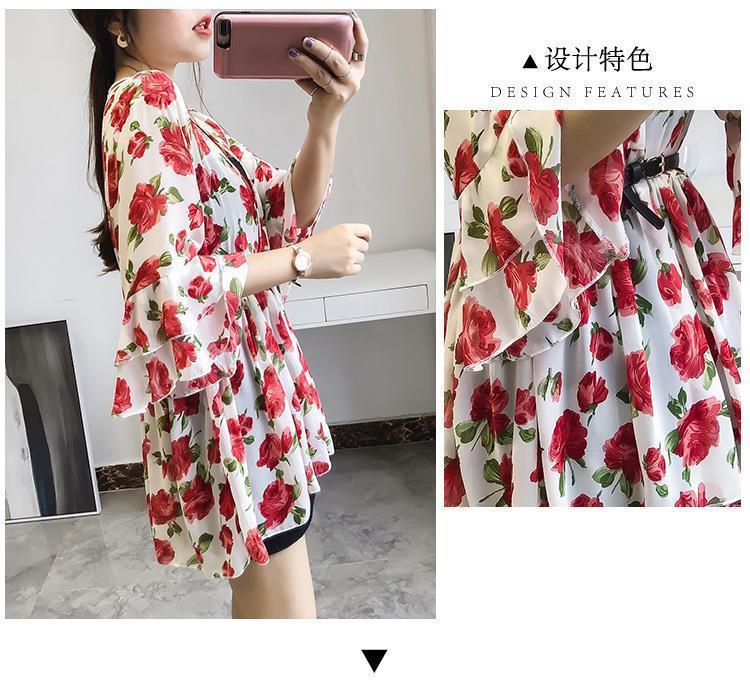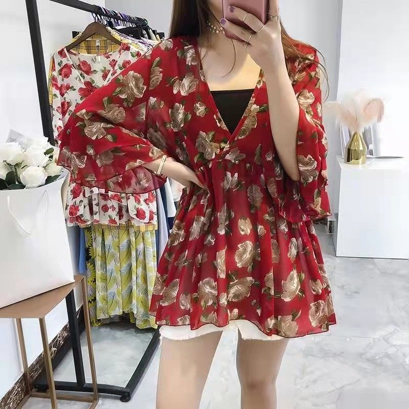 2024 여름 새로운 한국 스타일 달콤한 느슨한 꽃 셔츠 반팔 쉬폰 셔츠 여성용 슈퍼 요정 트럼펫 슬리브 트렌디 탑