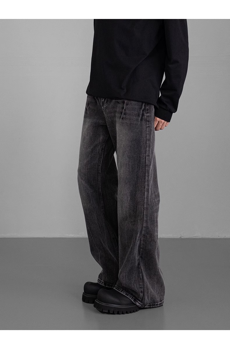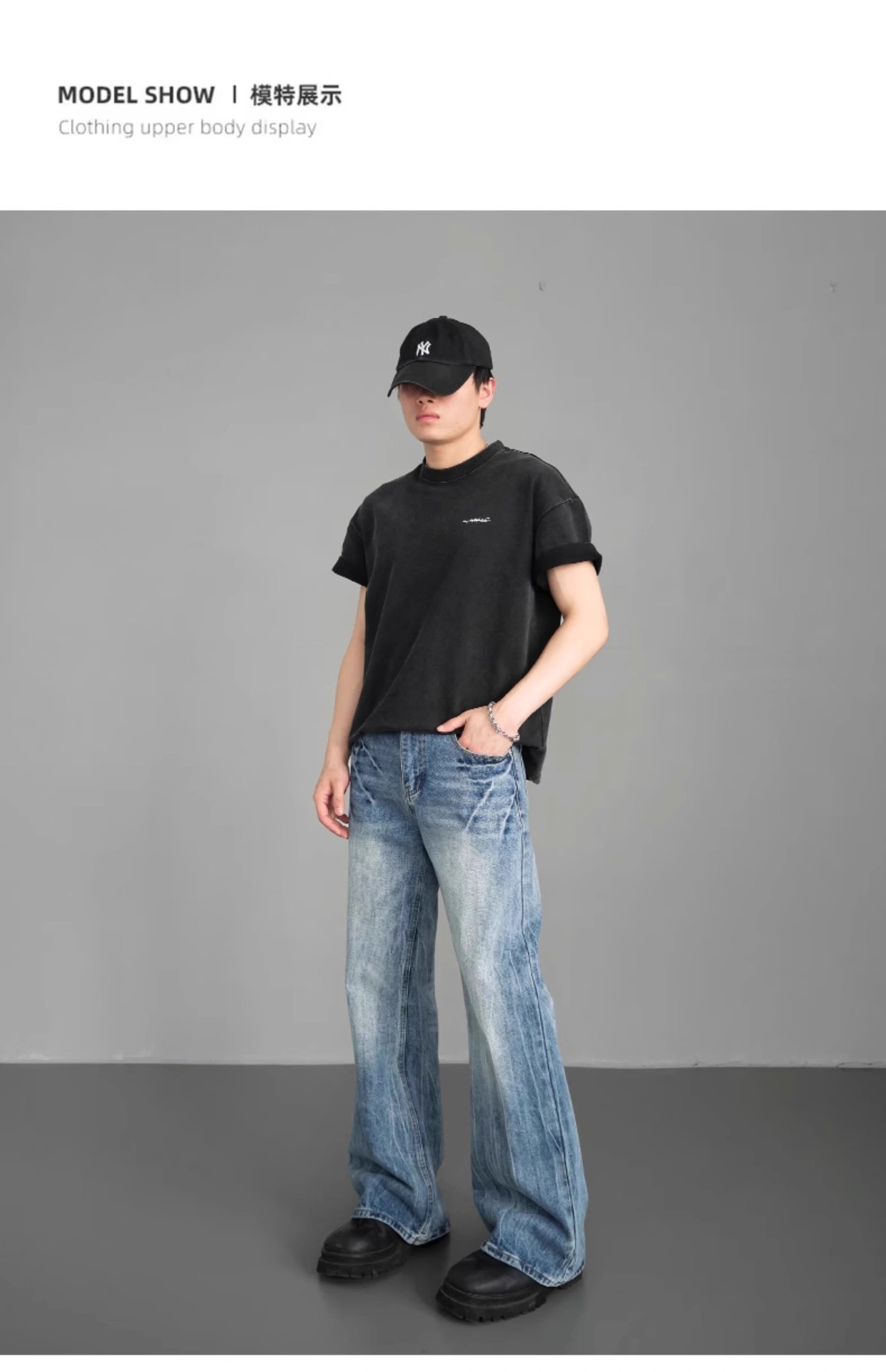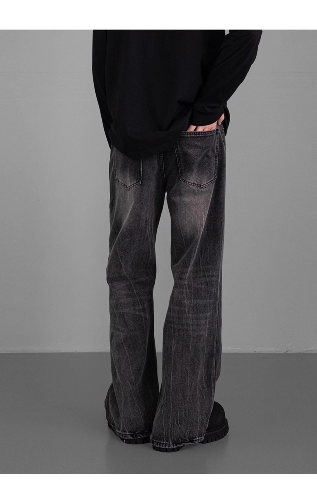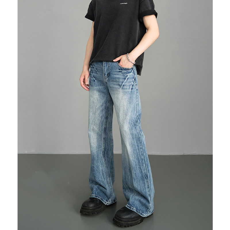 대외 무역 봄 신상품 아메리칸 하이 스트리트 타이 번개 균열 워싱 청바지 캐주얼 남성 스트레이트 레그 마이크로 플레어 바지스토어 가기