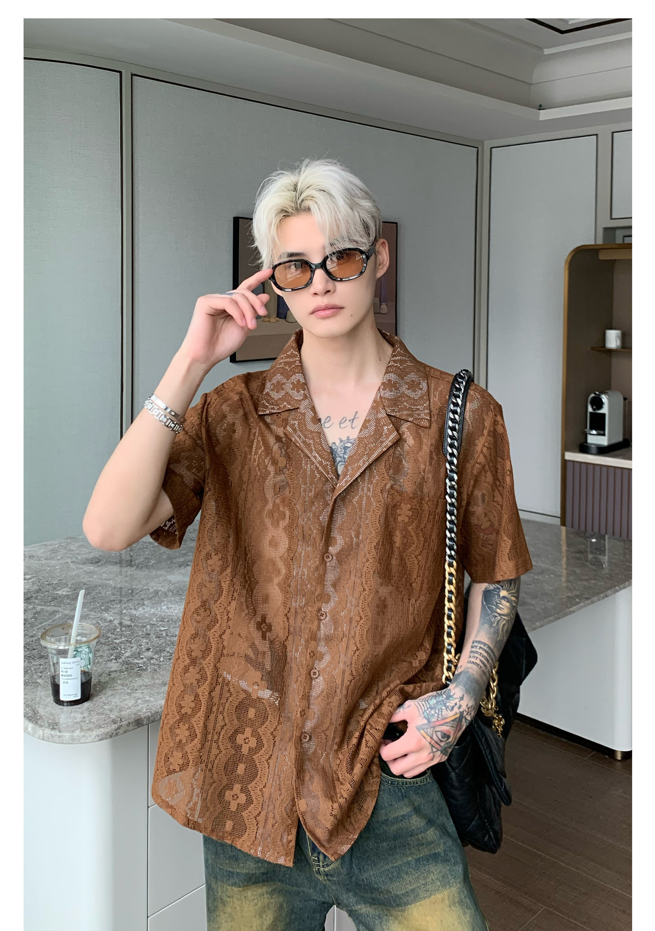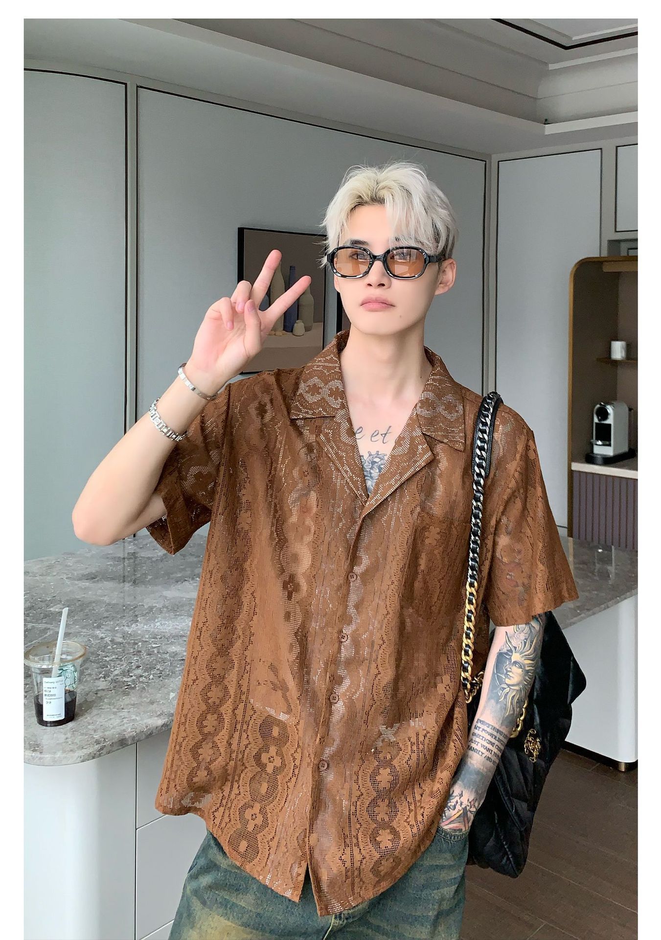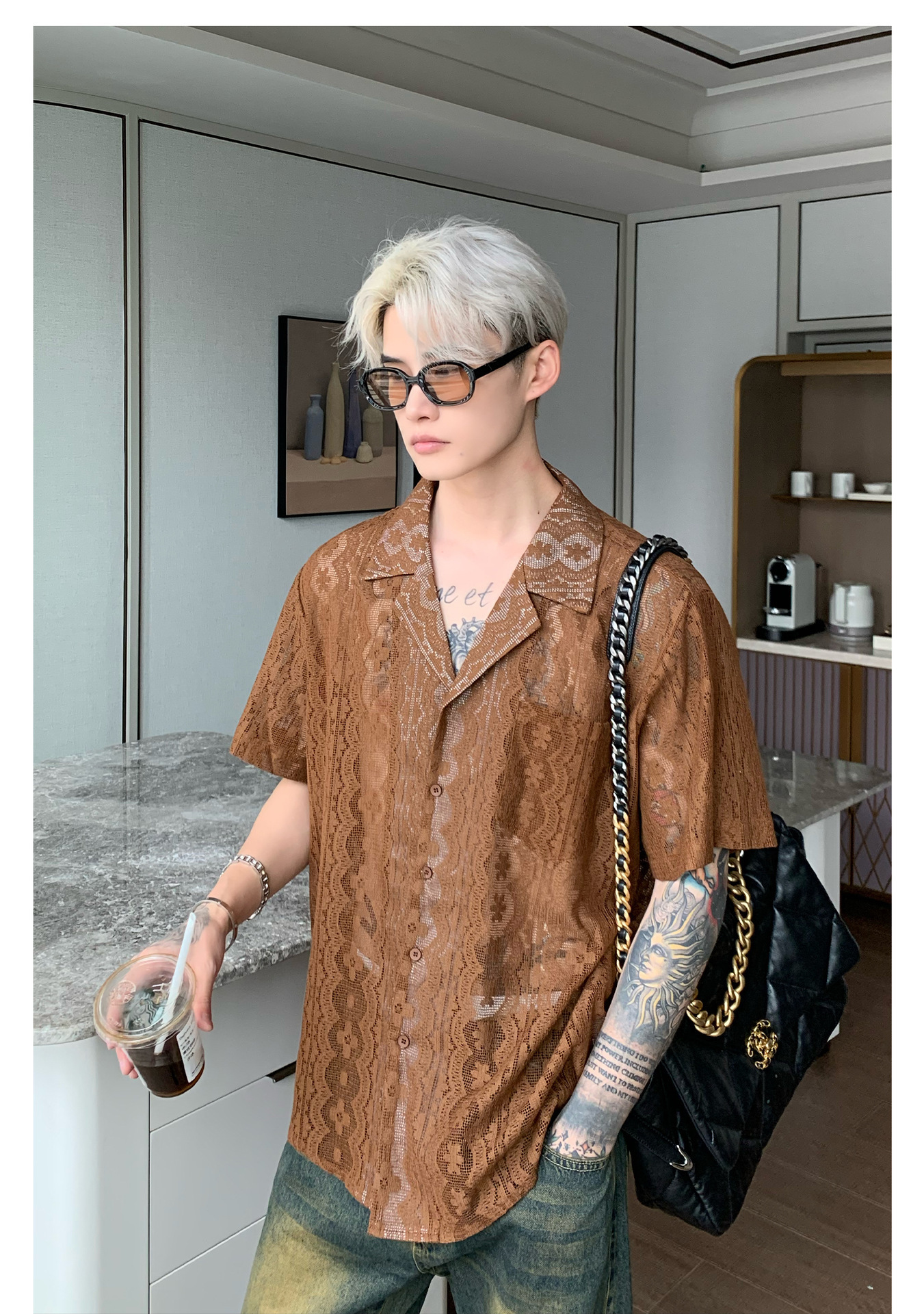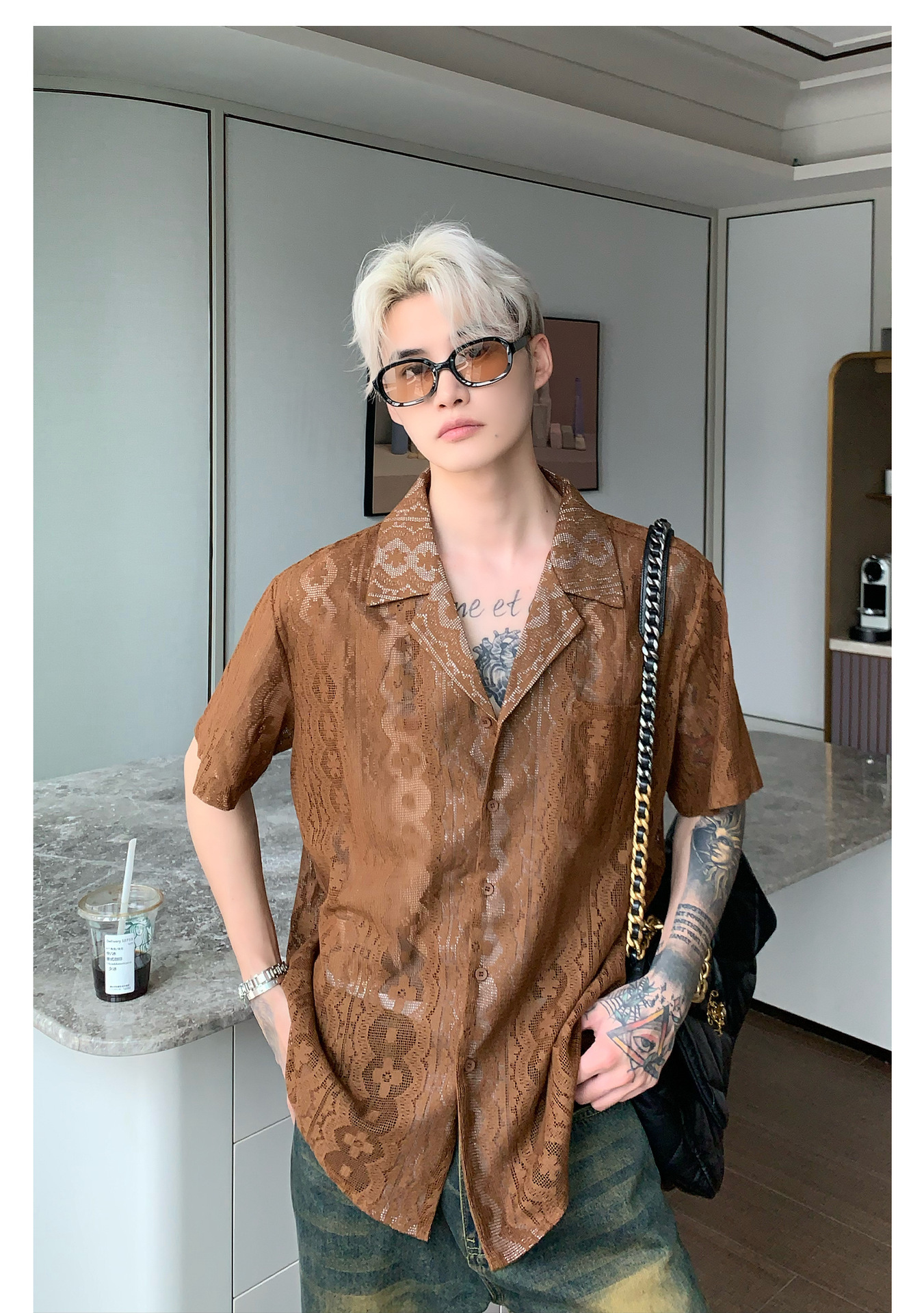 니치 빈티지 자카드 할로우 디자인 반팔 셔츠 남자의 2024 여름 새로운 스타일 게으른 스타일 옷깃 셔츠 트렌디스토어 가기